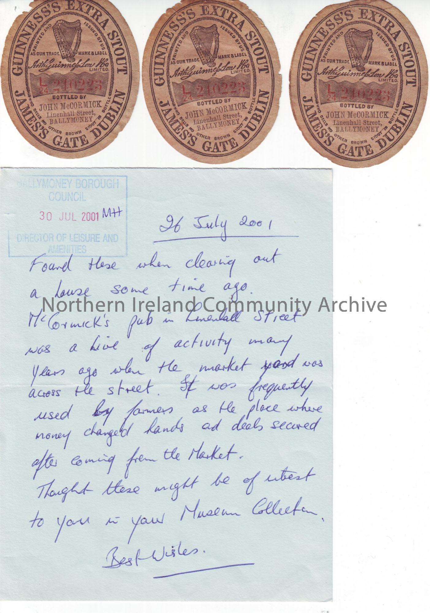 Guinness's Extra stout bottle labels for John McCormick Linenhall Street, Ballymoney-210223