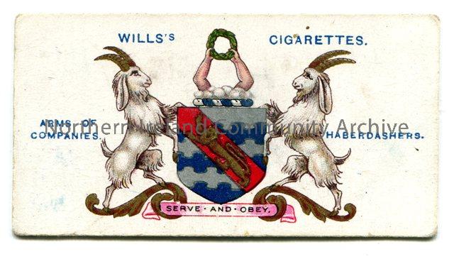 Cigarette cards dated 1913 showing the crests of the London Companies that planted Co L/Derry. This card shows the Haberdashers crest.