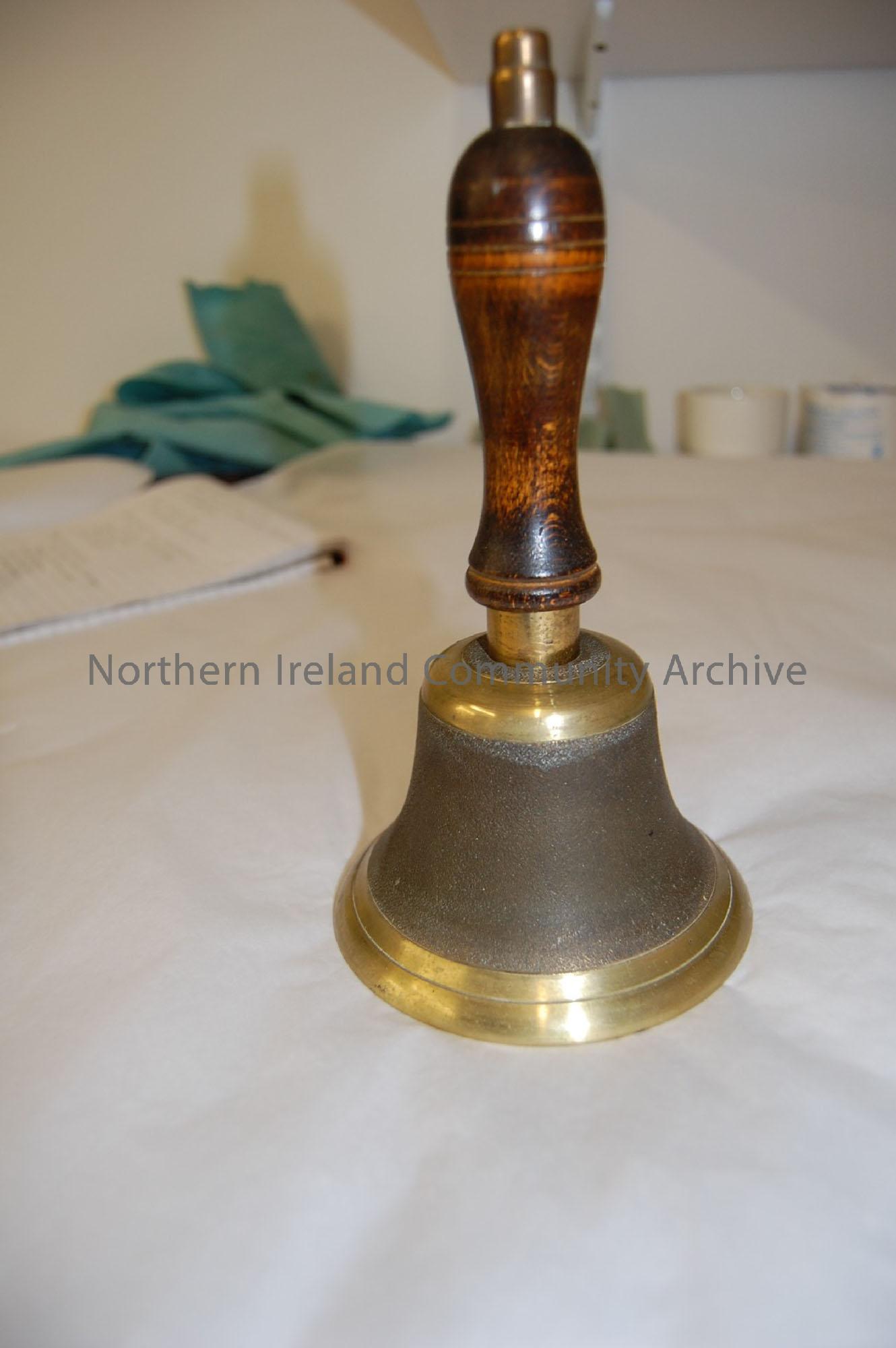 Hand bell from the Model School. Decorative wooden handle, brass bell. Given to donor by former headmaster W.J. Sands