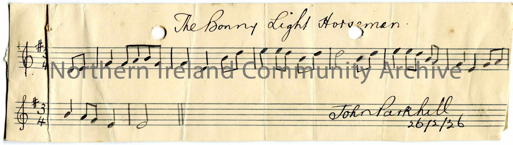 Hand drawn bars of music to 'The Bonny Light Horseman'. Signed John Parkhill, 26th February, '26.