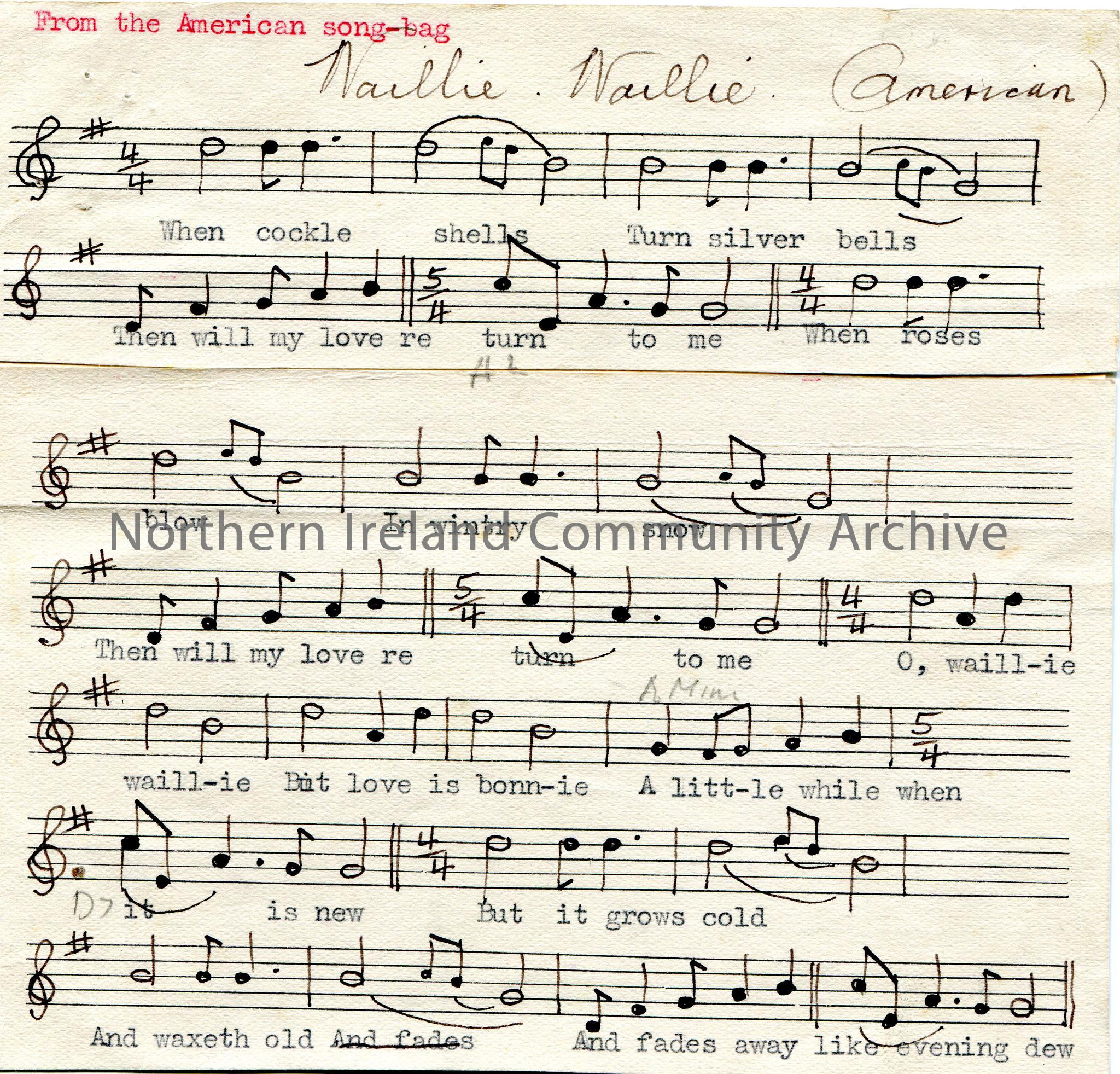 Hand drawn bars of musical notes and words to the tune of 'Naillie Wallie'. States that it is American, from the American song-bag. Top part of page has been attached to bottom part.