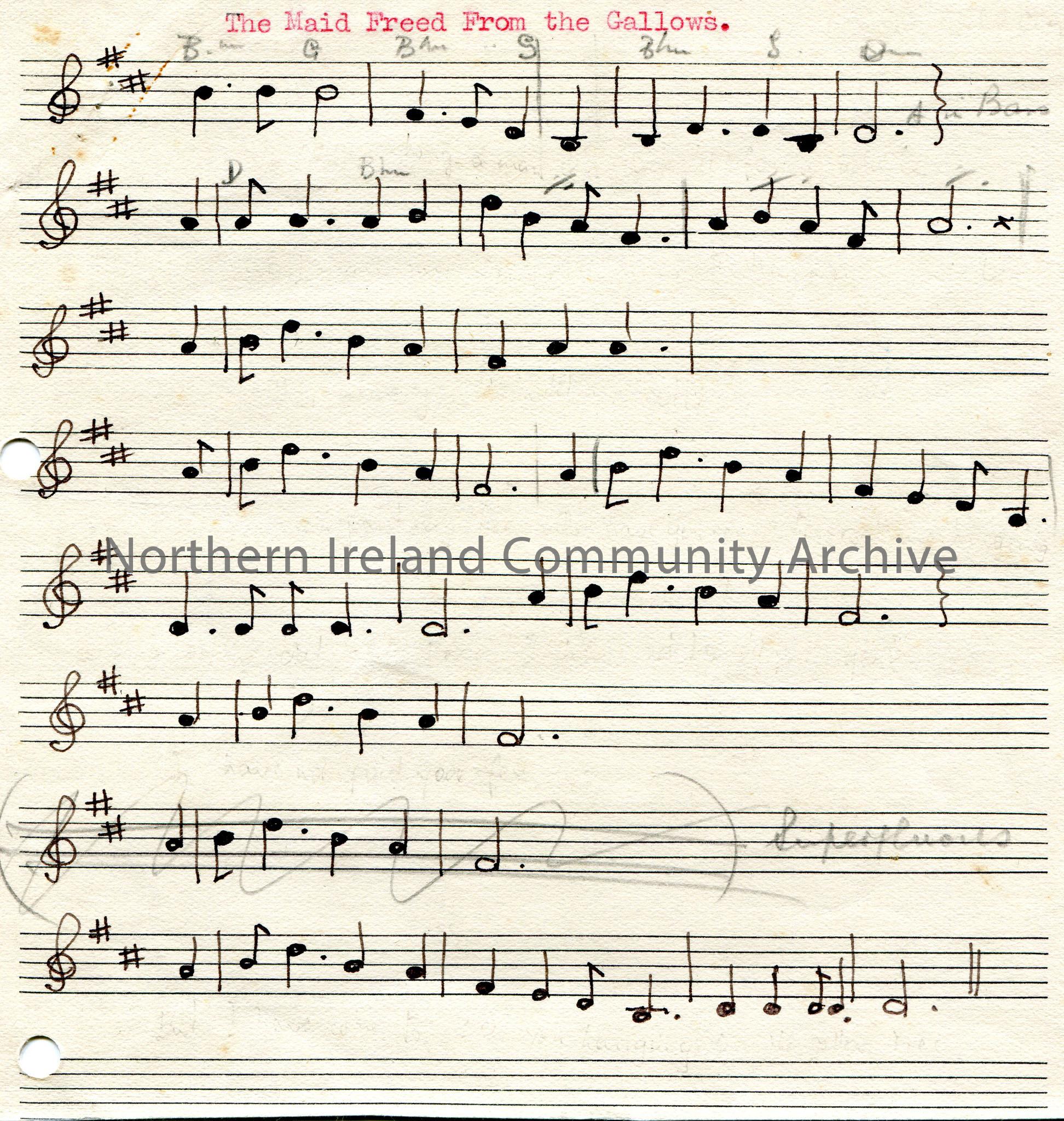 Hand drawn bars of musical notes to the tune of ‘The Maid Freed From The Gallows’.