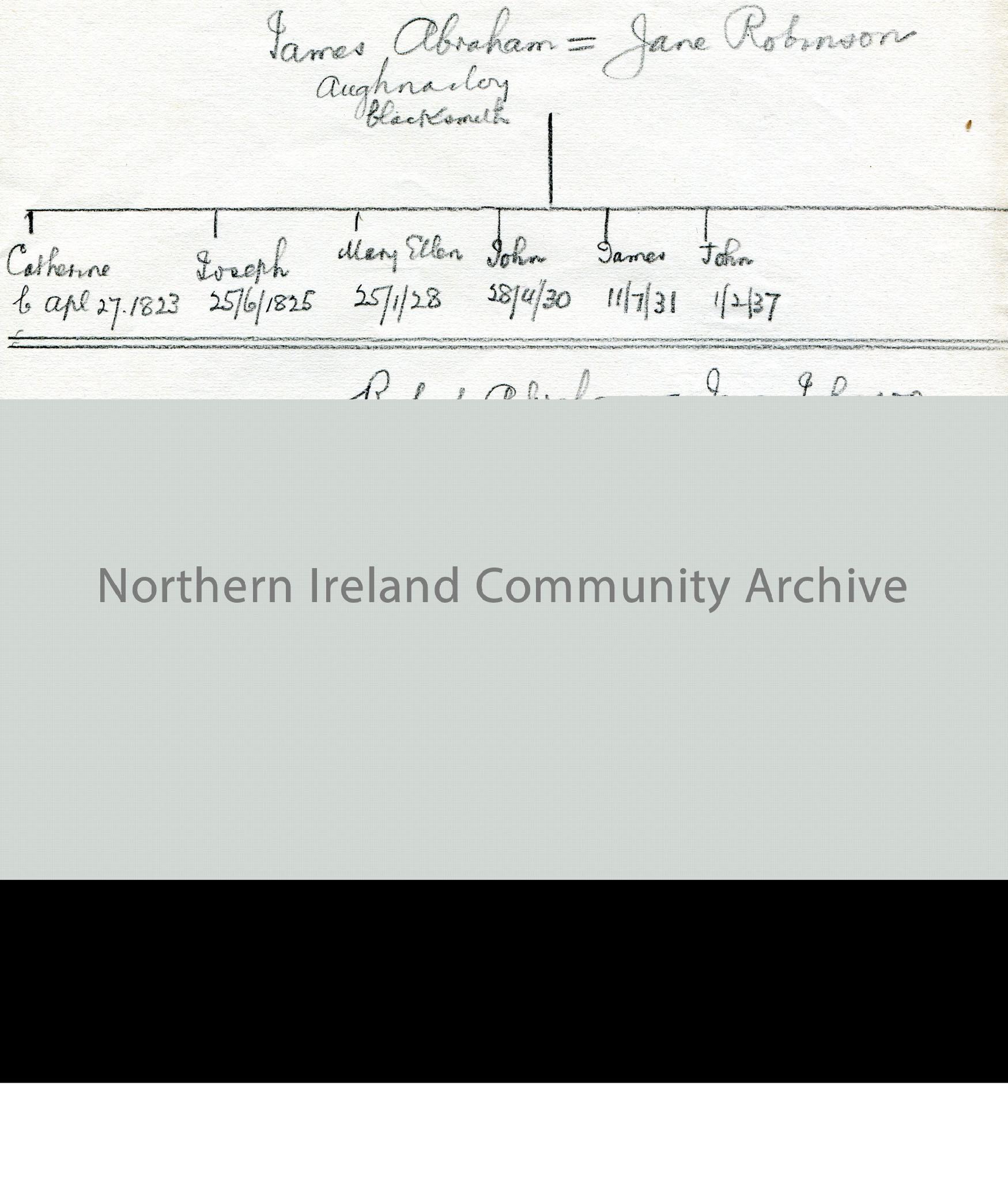 Hand drawn diagram of the ‘Abraham’ family tree. Drawn in pencil. The marriage of James Abraham and Jane Robinson is at the top. Dates are first half …