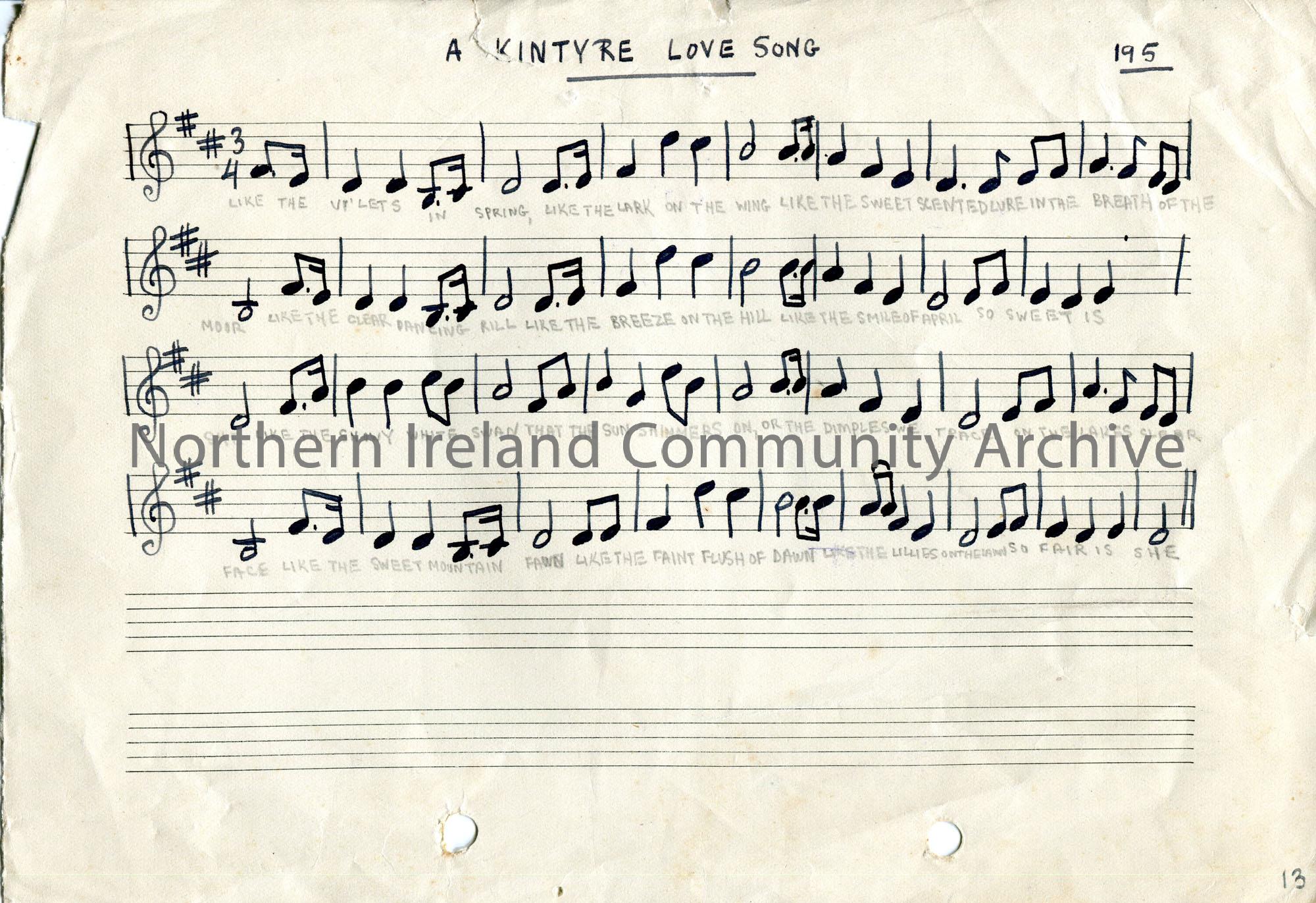Hand drawn musical notes and words on manuscript paper to ‘A Kintyre Love Song’.
