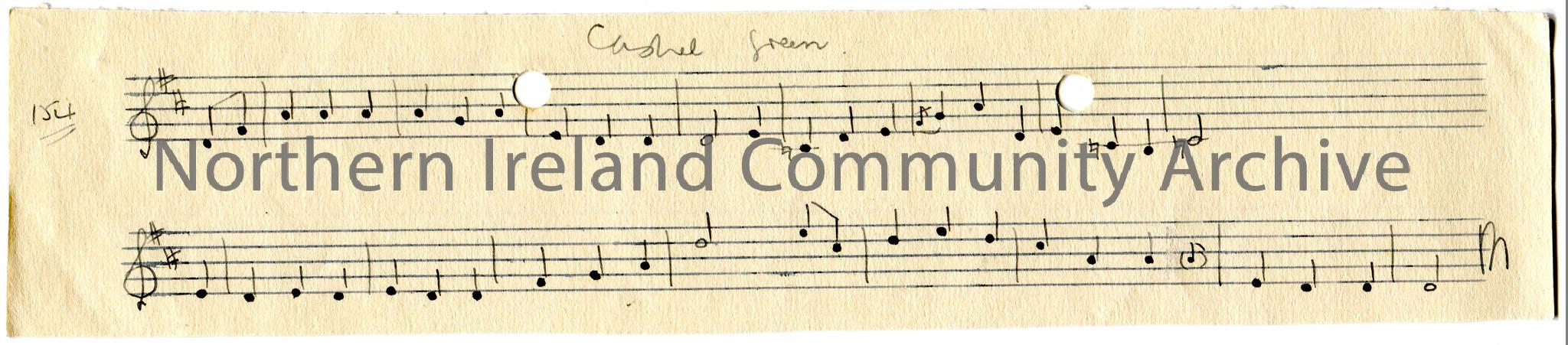 Hand drawn musical notes on a strip of paper for a song titled, 'Cashel Green'.