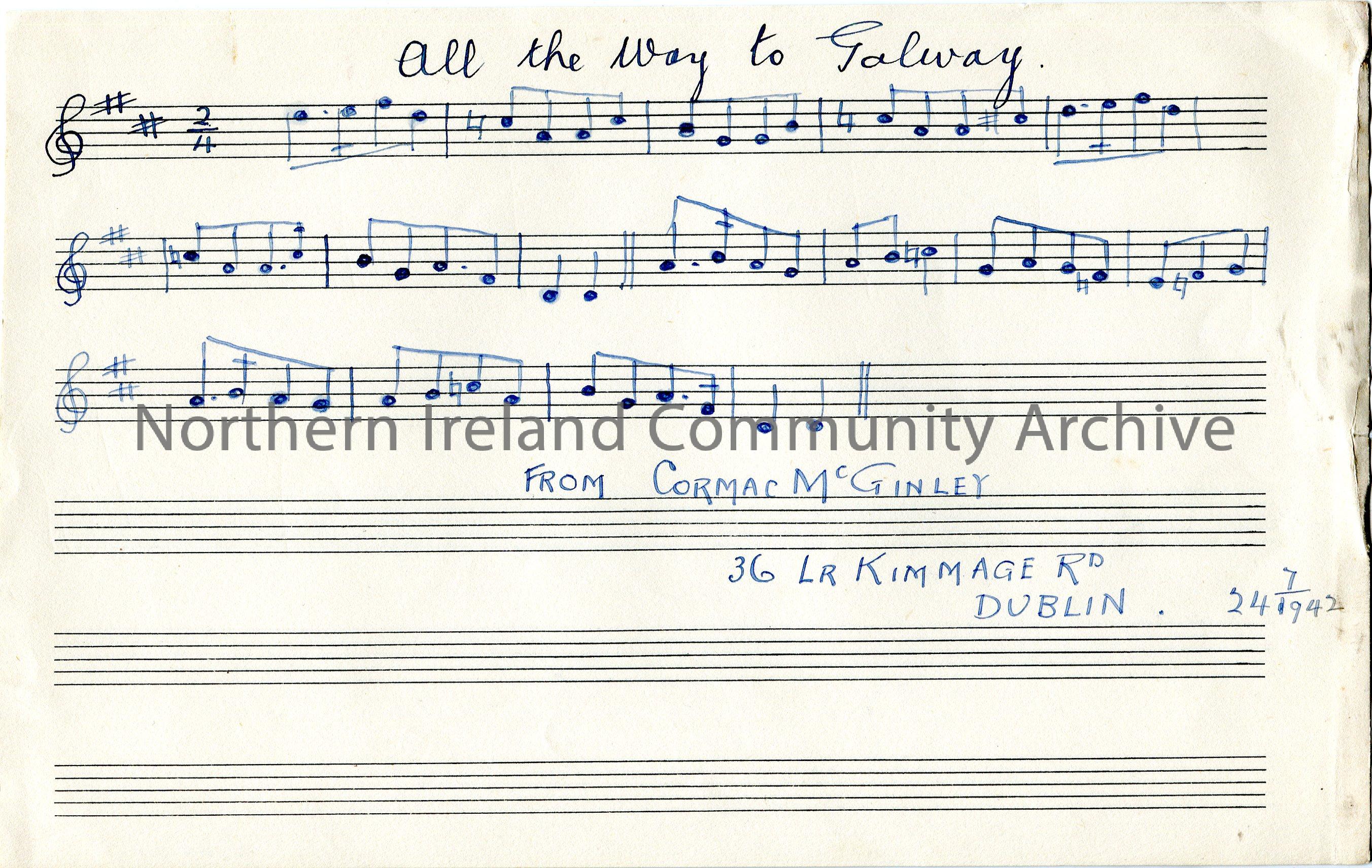 Hand drawn musical notes to ‘All the way to Galway’. From Cormac McGinley, 36 Lower Kimmage Road, Dublin. 24th July 1942.