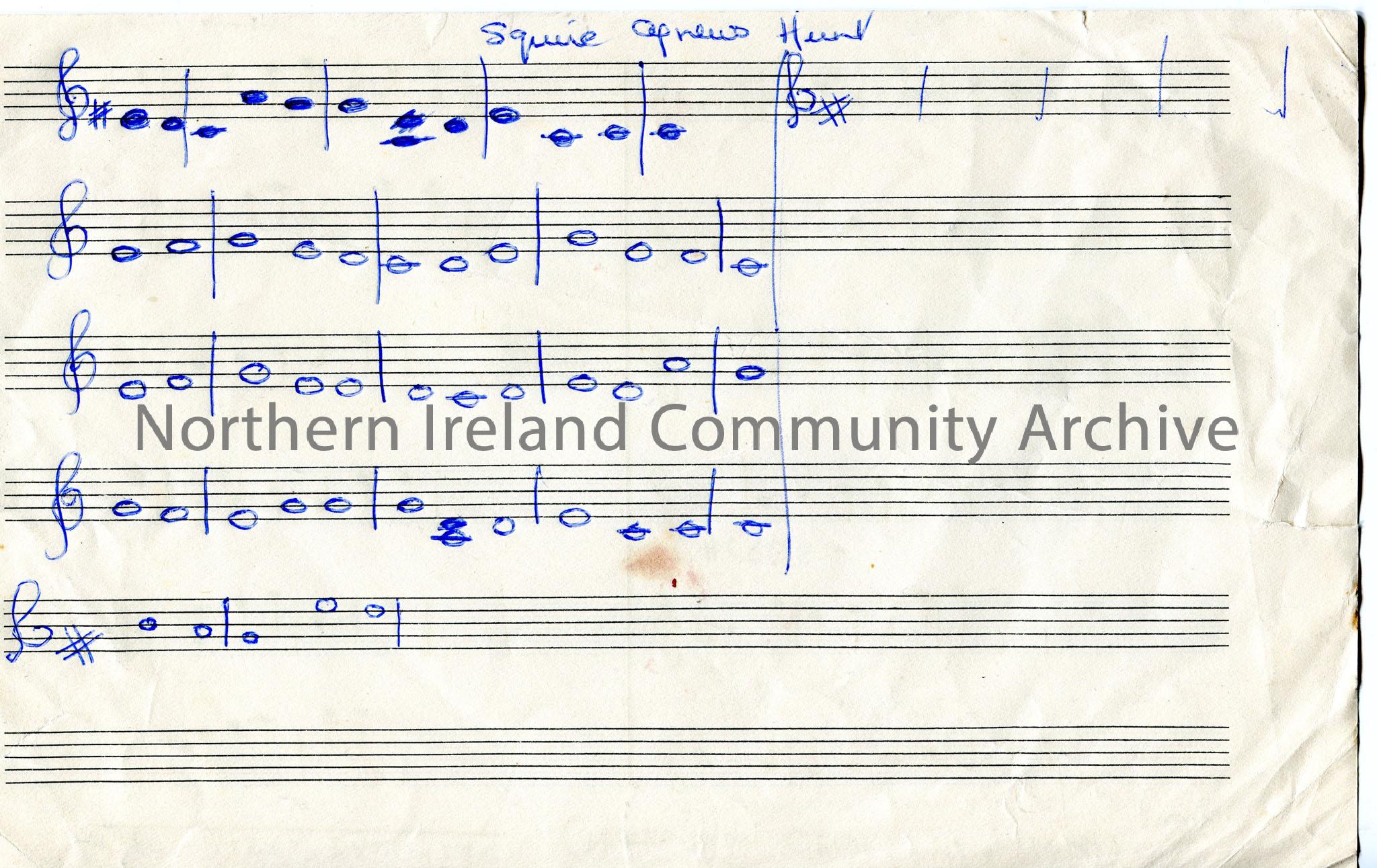 Hand drawn musical notes to two songs, one on each side of page. Song titled, 'The Miller's Daughter, (Noted from Olive - 26.7.1944)' on one side in pencil. Other song titled, 'Squire Agnews Hunt' on the other side drawn in Biro pen.