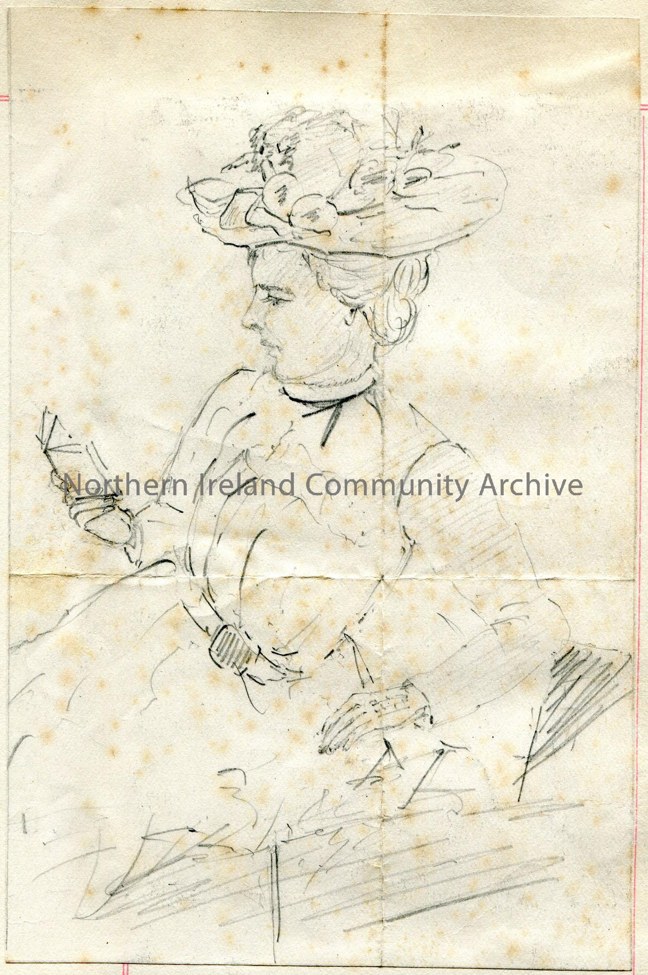 Hand drawn pencil sketch of a woman sitting reading a book. Captioned, ‘Scrabo, 1930’ above drawing.
