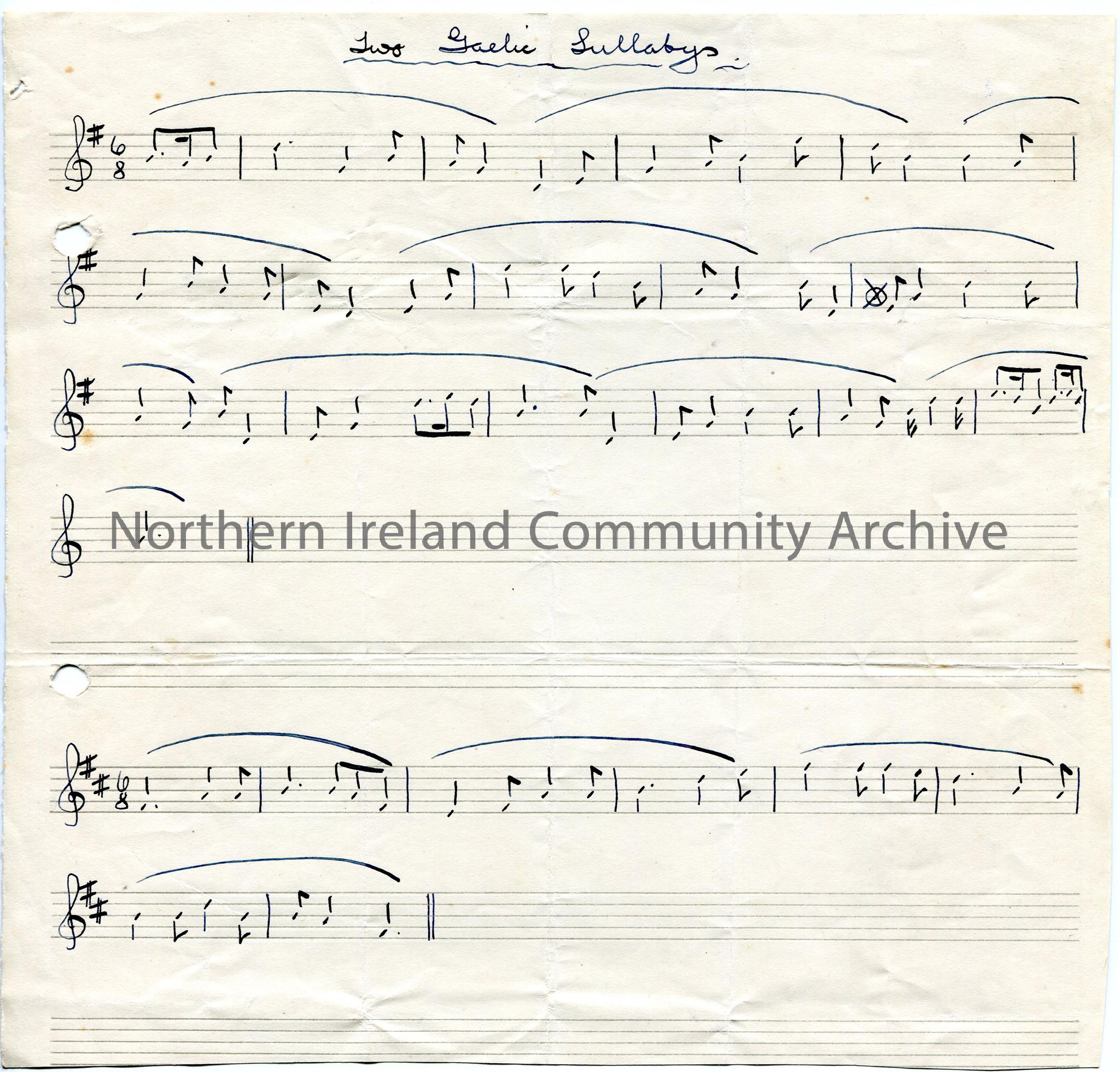 Hand drawn staff notation - 'Two Gaelic Lullabys'.