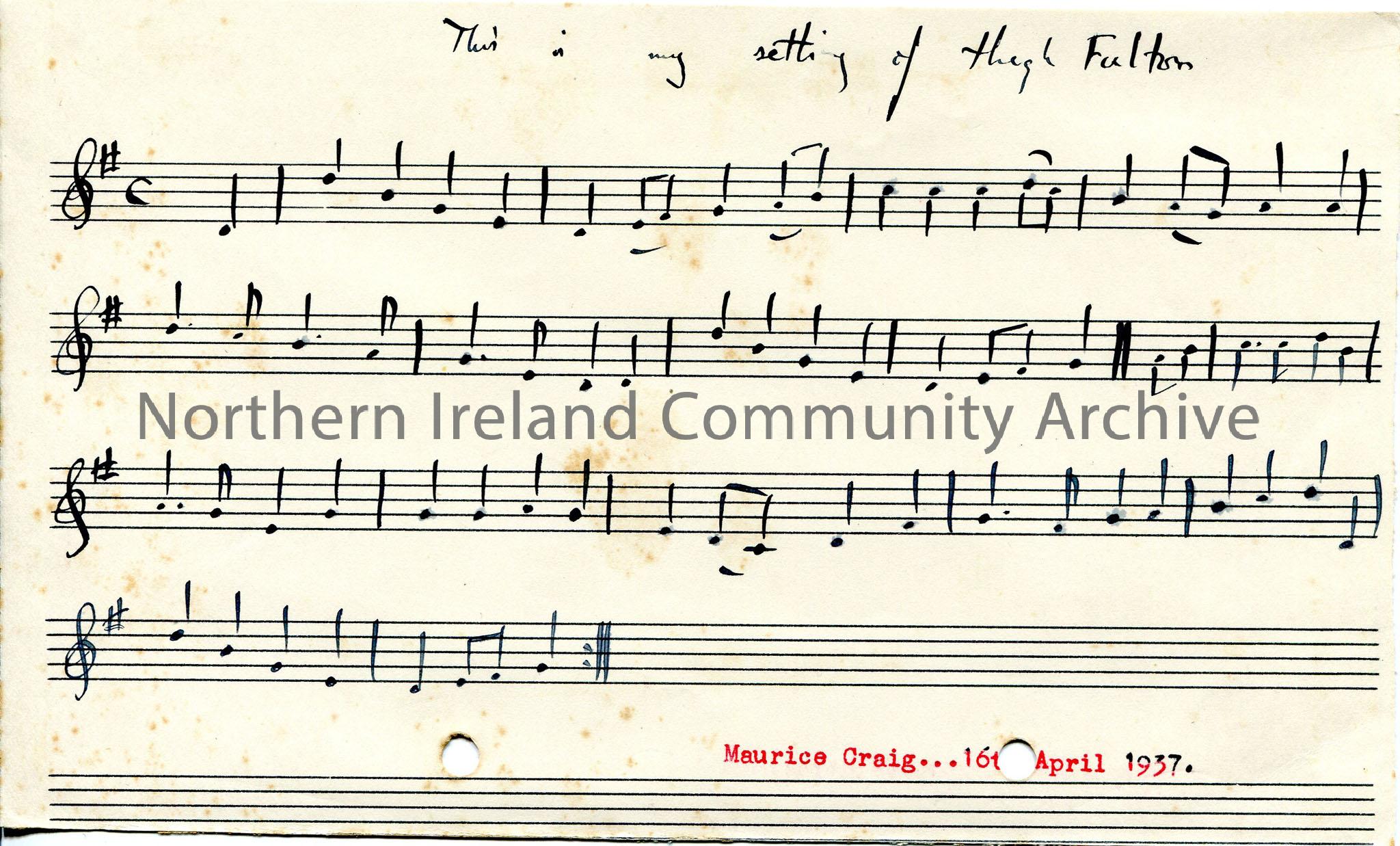 Hand drawn staff notation under note ‘This is my setting of High Fulton’.
