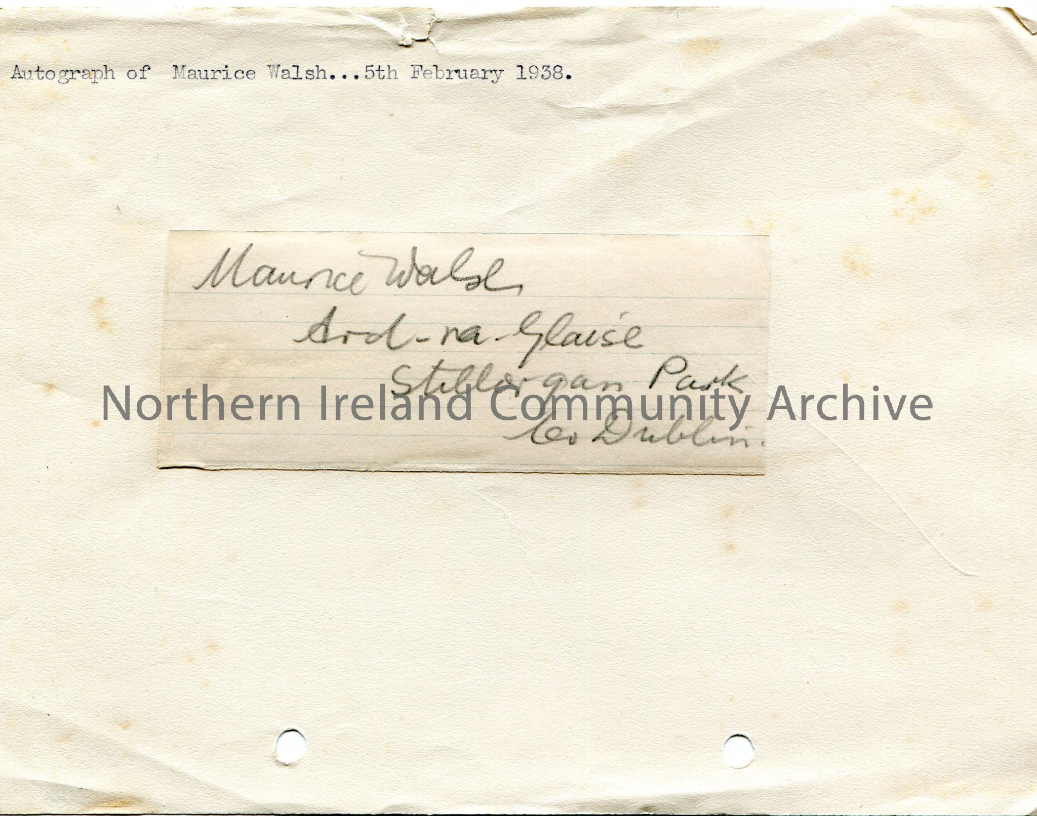 Hand signed autograph in pencil of Maurice Walsh. Dated 5th February, 1938. Also includes address- Ard-na-Glaise, Stillorgan Park, Co. Dublin.