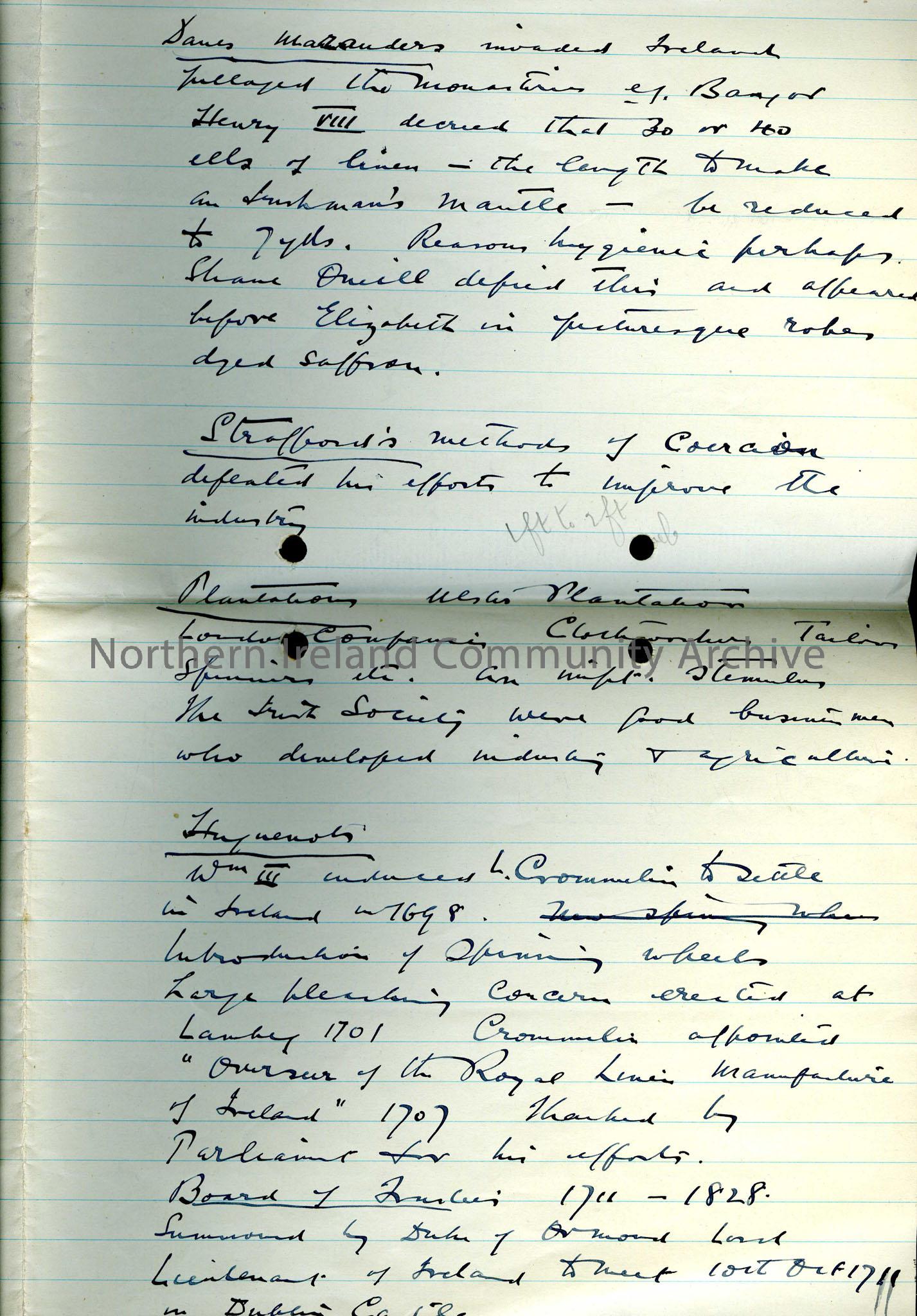 Hand Written document titled ‘History’ detailing various events in the history of Linen production from the Danish invasions to the Industrial Revolut… – Scan020A