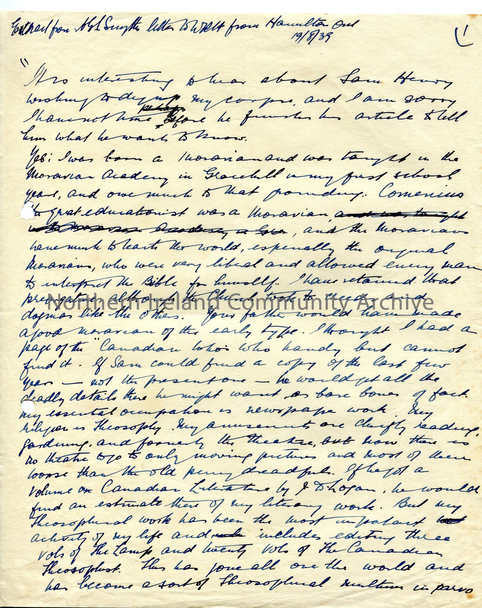 Hand written extract from letter to ?? Smythe to W R H from Hamilton Ontario, re an article Sam was writing about him and stating information re his connection with the Moravian Church at Gracehill.