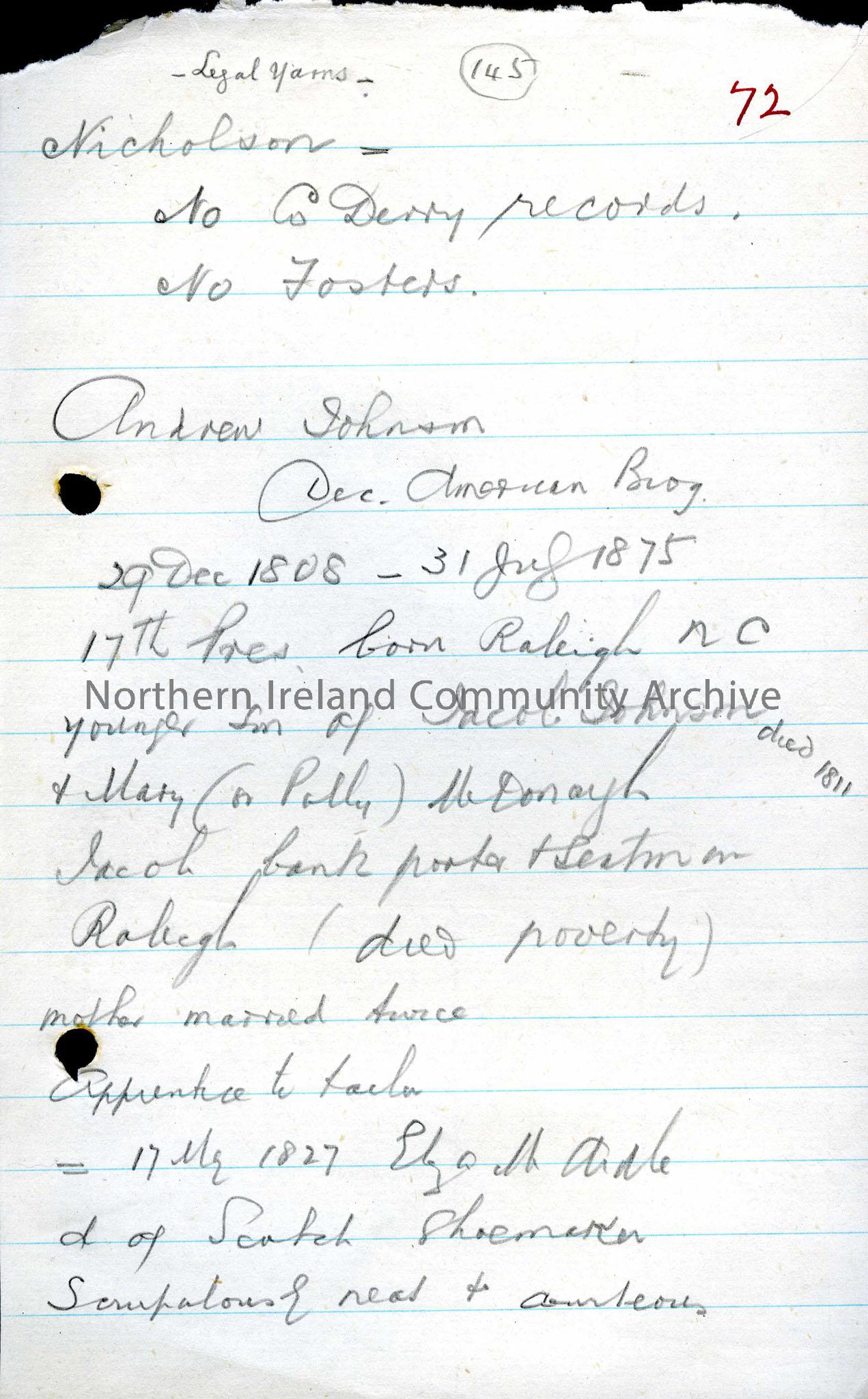 Hand written genealogical notes about Andrew Johnson among other seemingly unrelated notes.