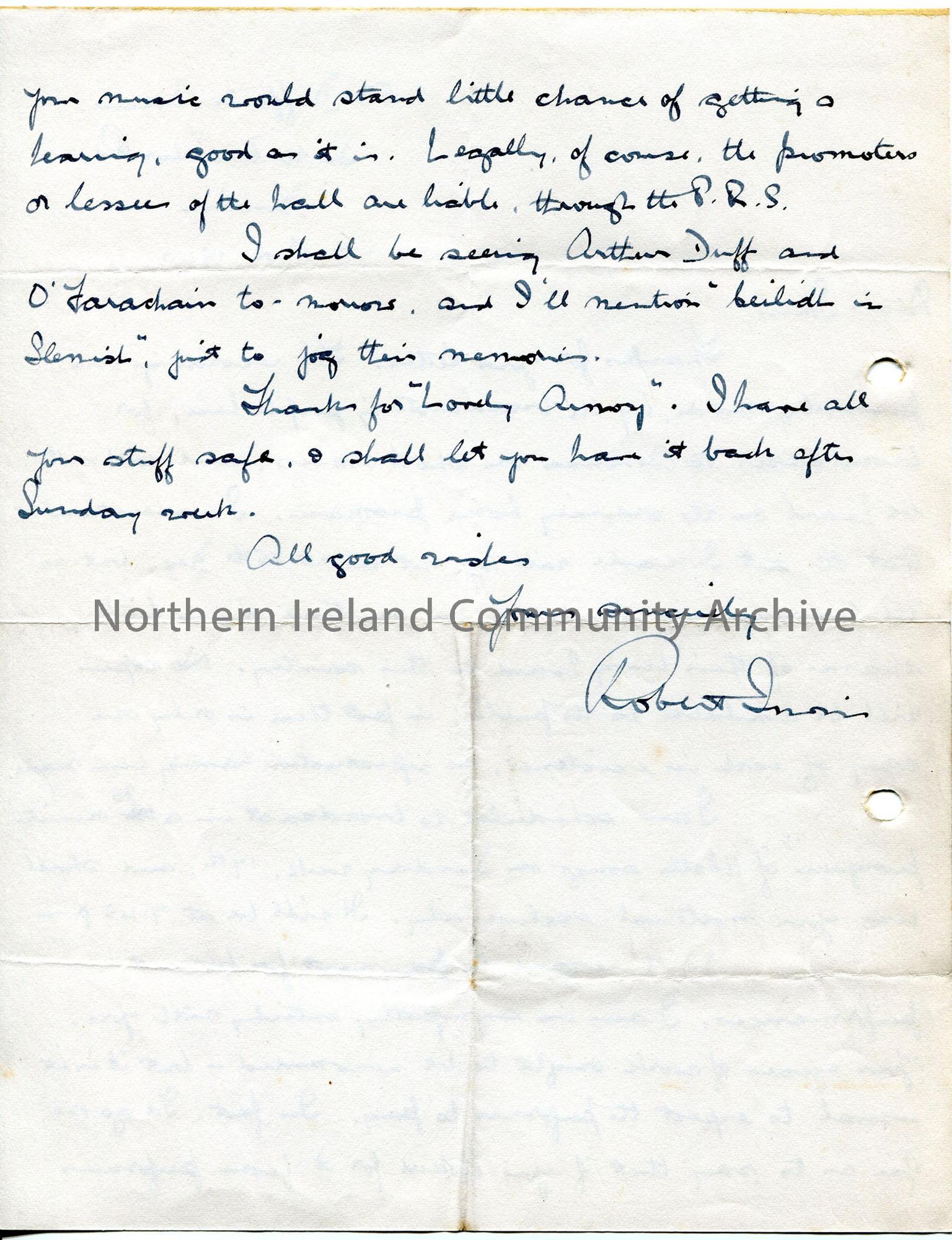 Hand written letter on 2 sides. Author relates times and airwave transmission of his broadcast of recordings to America. Also doing local broadcast u… – img086