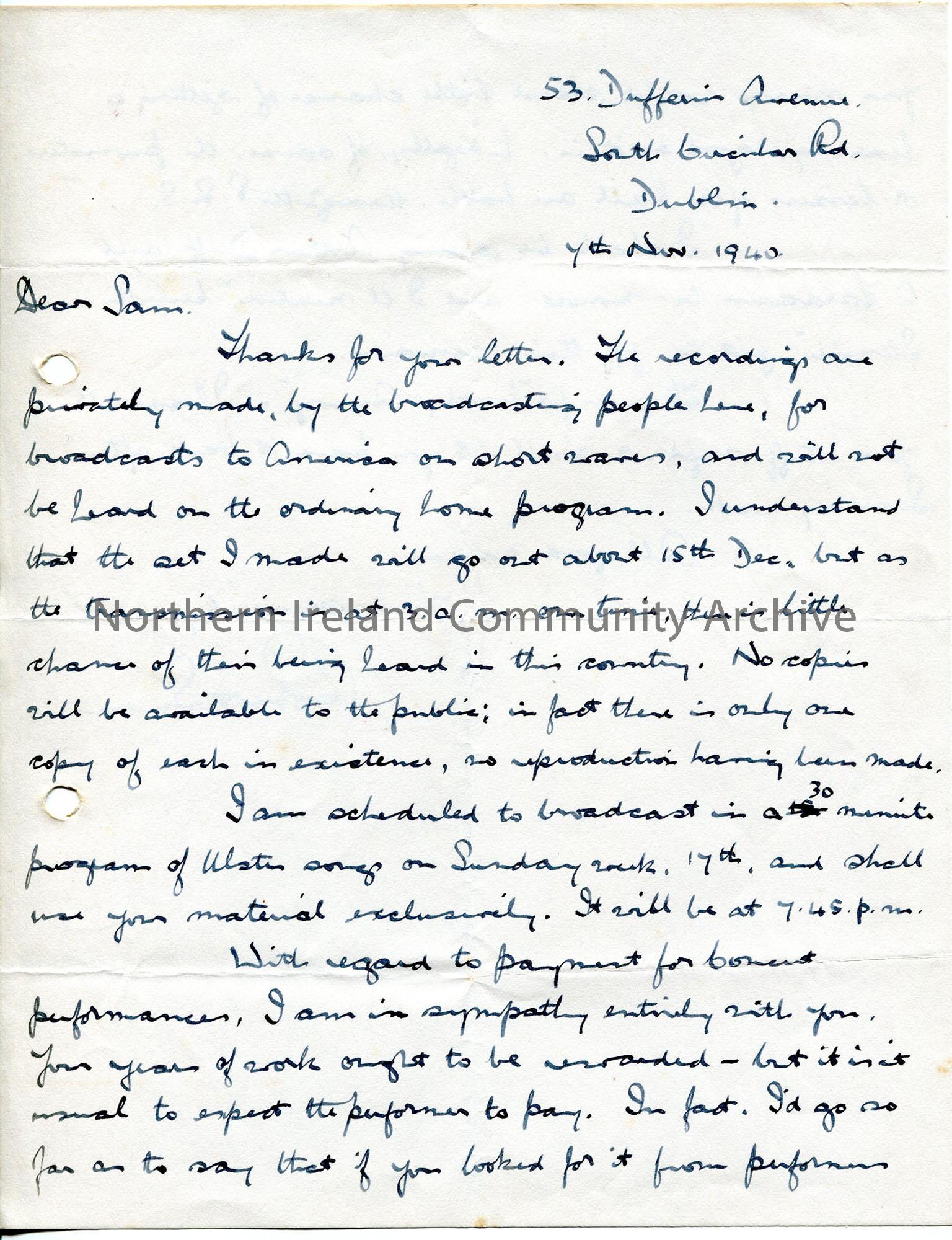 Hand written letter on 2 sides. Author relates times and airwave transmission of his broadcast of recordings to America. Also doing local broadcast using Sam's material exclusively. Says if Sam expects performers to pay him for using his music, it will stand little chance of being used. Thanks for other songs sent by Sam