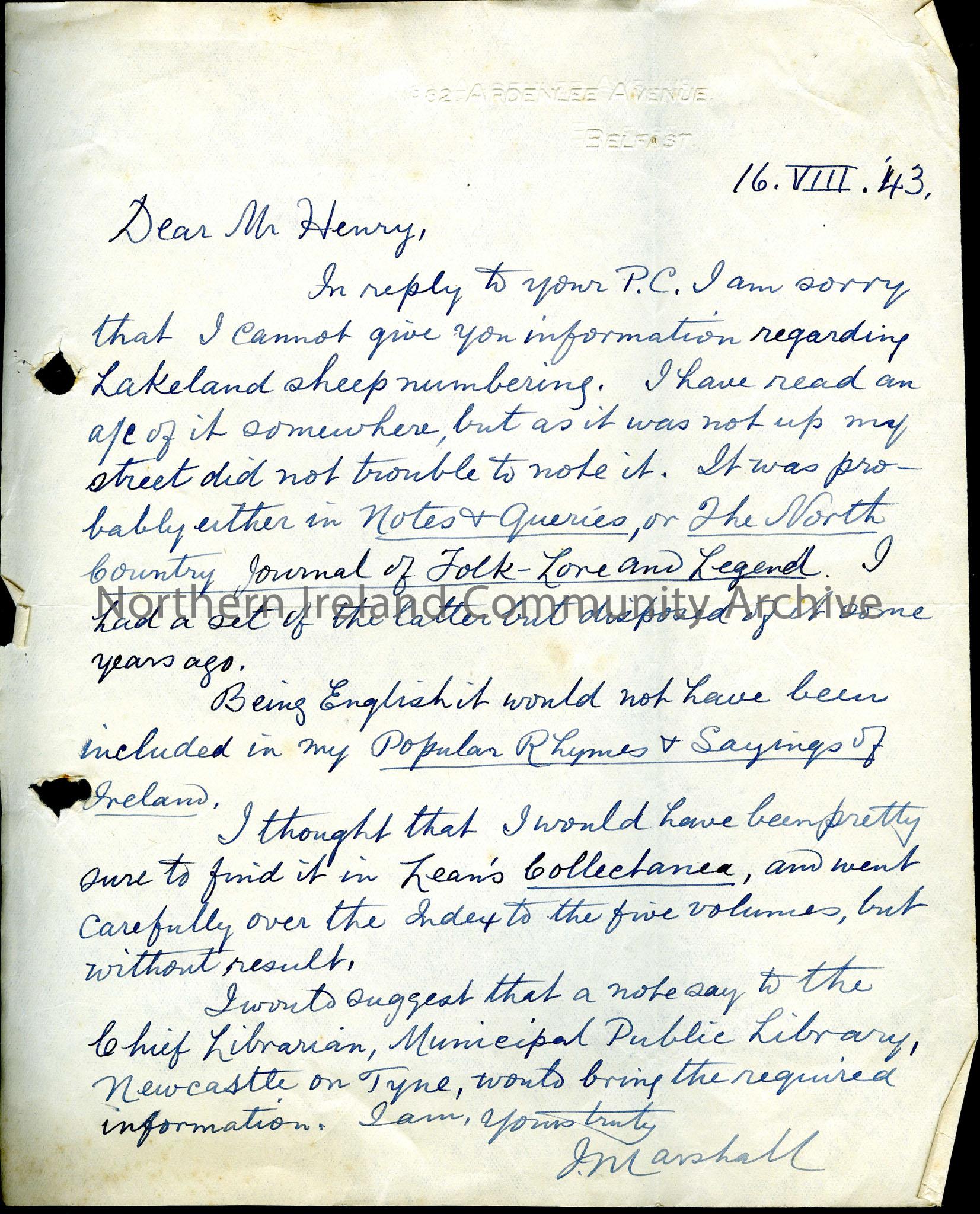 Hand written letter to Mr Sam Henry from J. Marshall responding to a query regarding lakeland sheep numbering, wherein Marshall is unable to provide an answer but proposes several alternative sources of information. Dated 16.8.1943.