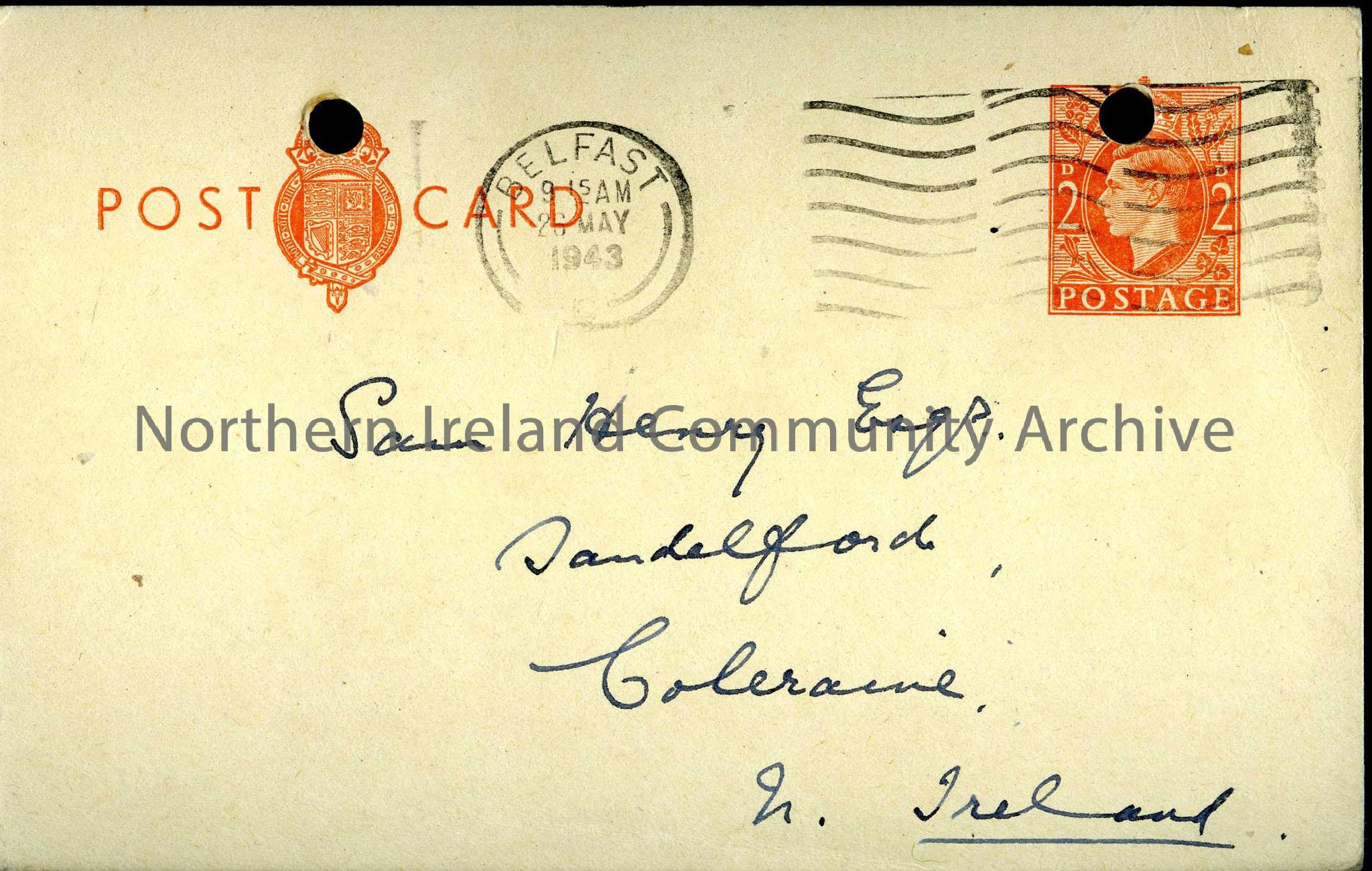 Hand written postcard to Mr Sam Henry from Andrew Brockart(?), Belfast, thanking him for his postcard and stating that they have no portable electric battery but can provide alternative light sources. Post marked 26.05.1943.
