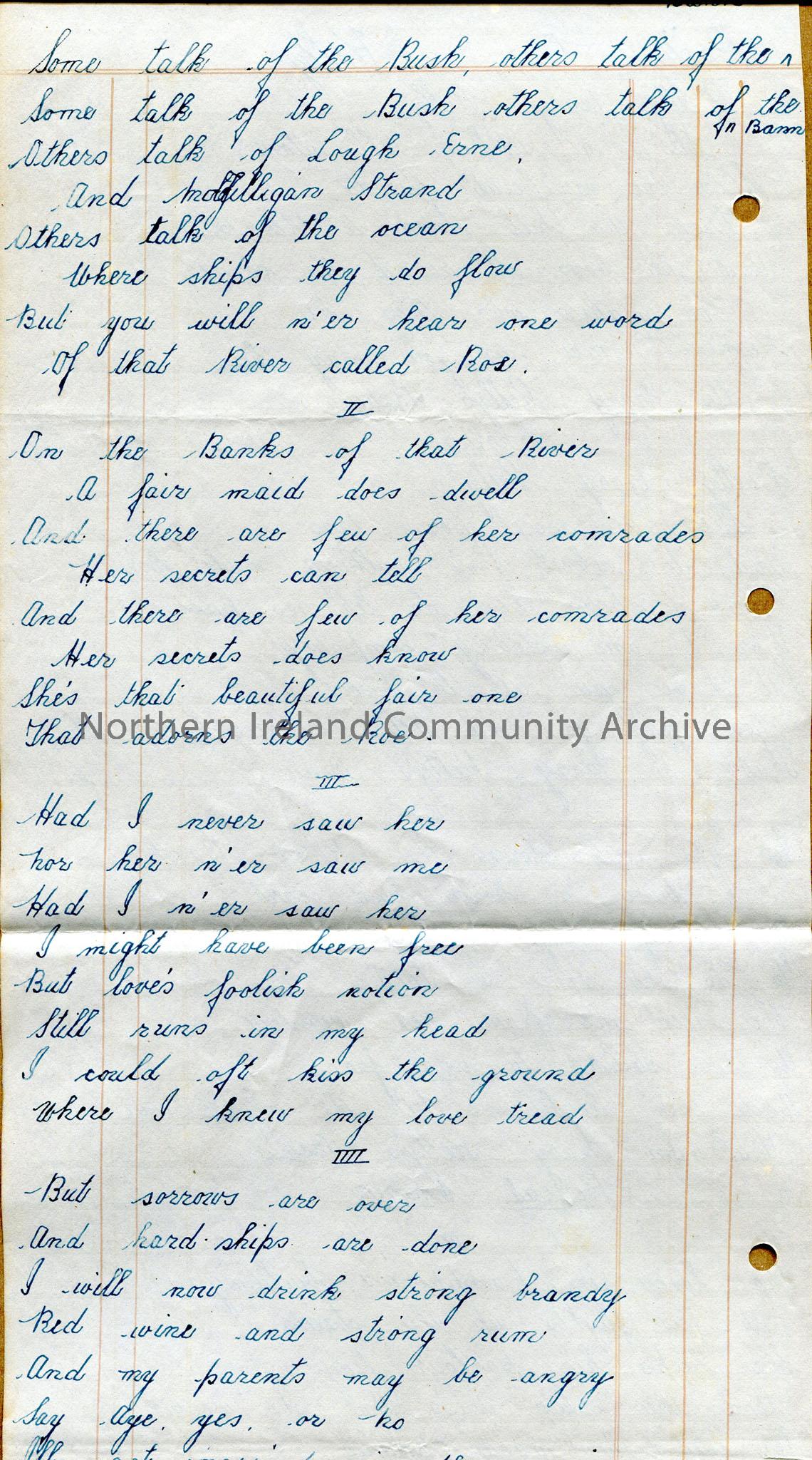 Hand written words to 2 songs, 1 on each side of page - 'Pretty Mary Kelly' and 'Some Talk of the Bush, Others Talk of the Bann'. Mentions Magilligan, Roe,