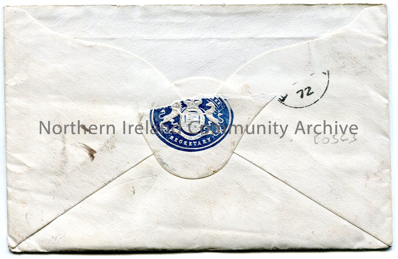Handwritten addressed envelope to John Hezlet Esq., Bovagh, Aghadowey, Ballymoney. Date stamp of Dublin 11th September, 1872 on front. Red one penny Queen Victoria postage stamp, with perforated edges, on top right corner. Blue Lord Chancellors Secretary embossed seal on back of envelope.
