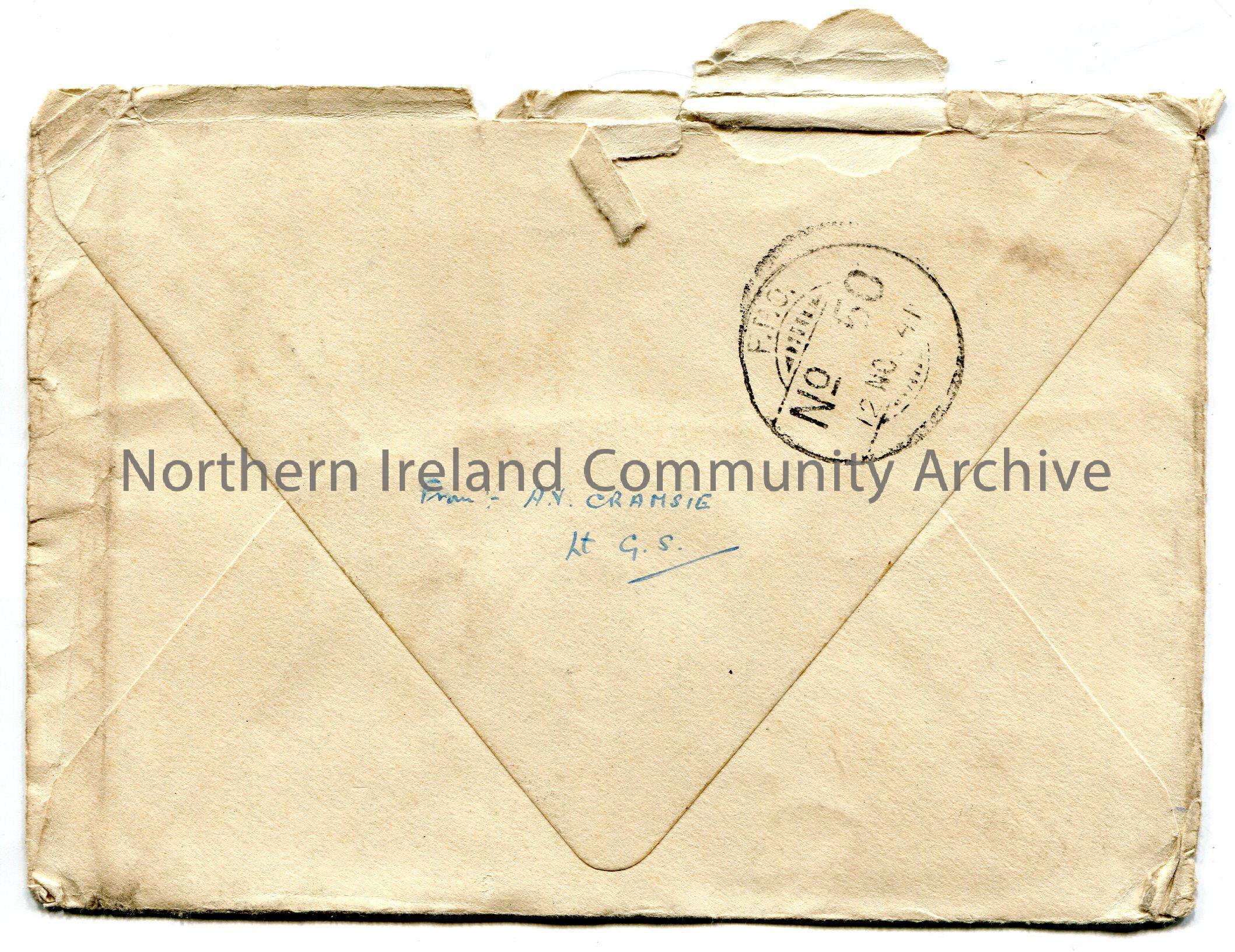Handwritten addressed envelope to Mrs Robert Hezlet, 81a Portway, Warminster, Wills - the Bovagh residence is scored out. 'On Active Service' handwritten at top of envelope. Triangular 'Passed By Censor No. 3456' stamp on front. From A. V[?] Cramsie Lt G.S. Black stamp on back states 'F.P.O. No. 50. 12 nov 41''.