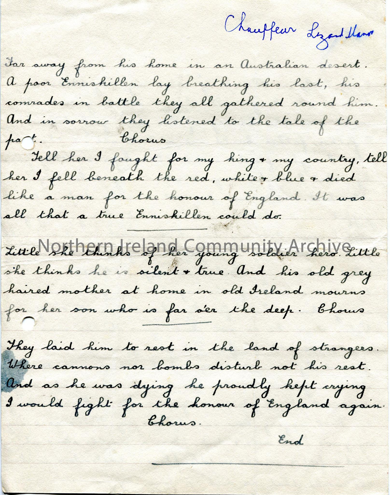 Handwritten – alternative words to ‘Father build me a boat’ on one side and words to untitled poem on the other.