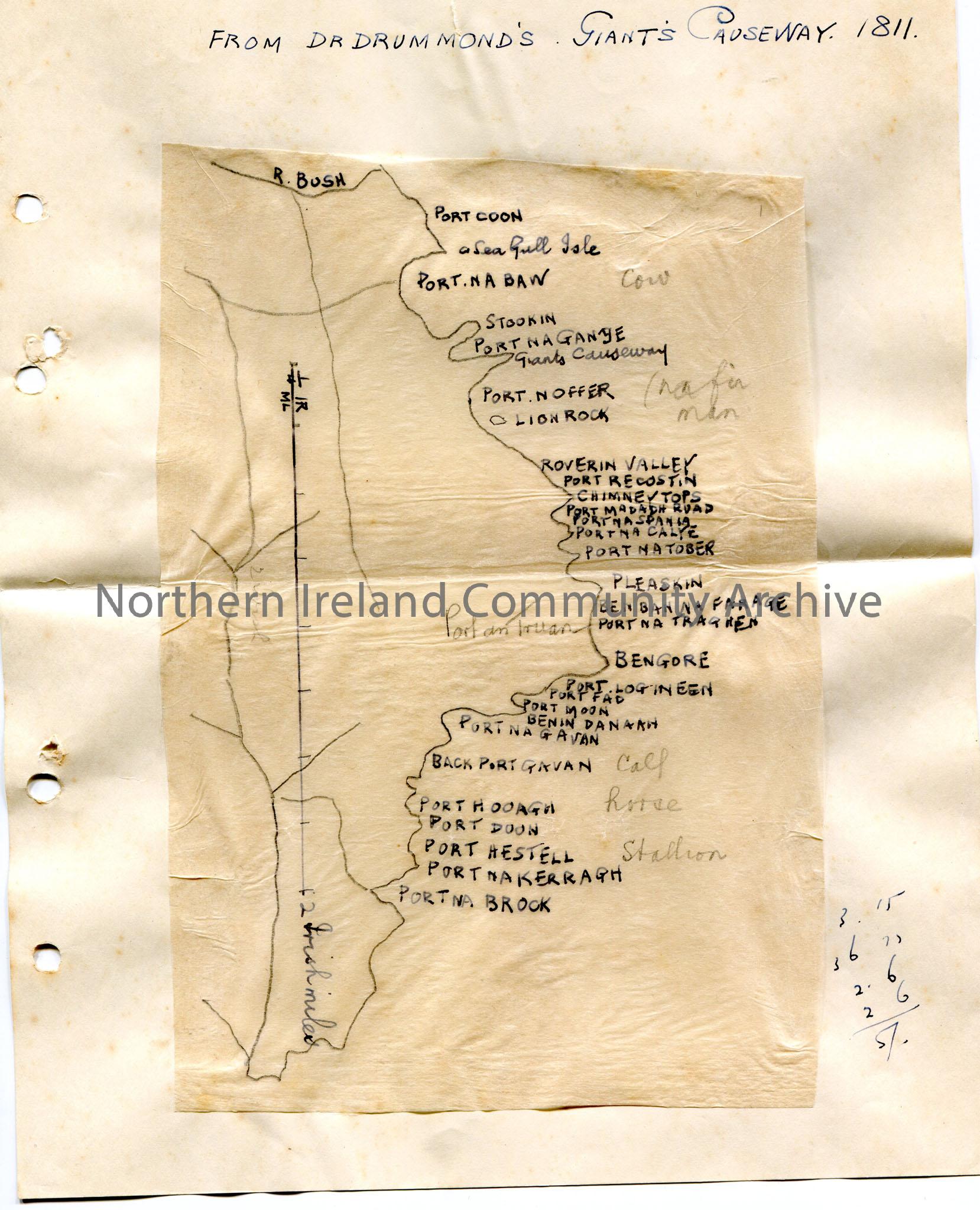 Handwritten and hand drawn diagram of ports. Cut out piece of tracing paper glued to white page. Titled, 'From Dr Drummond's Giant's Causeway. 1811'. Begins at Port Coon and ends Portna Brock.