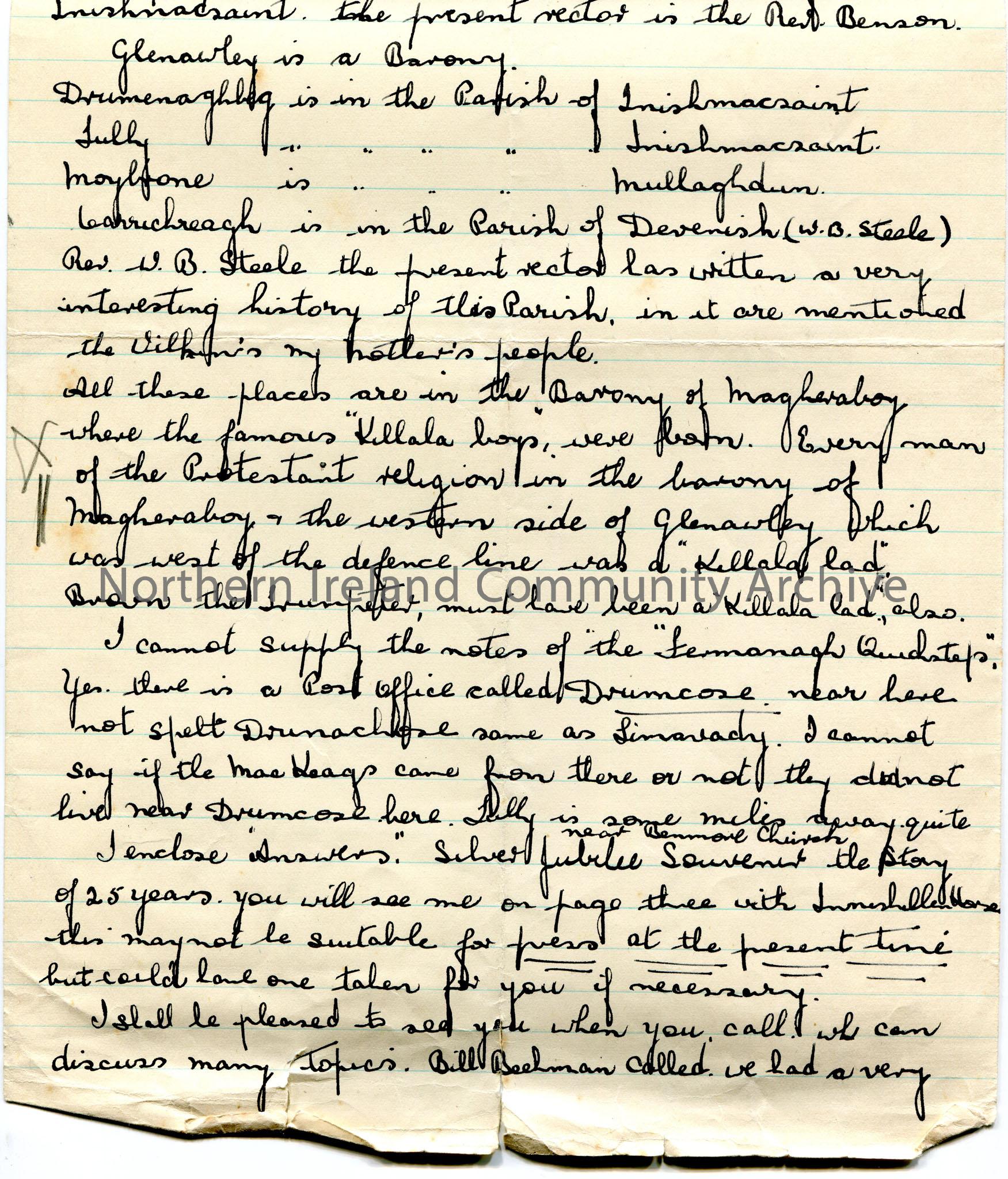 Handwritten answers to questions (double sided on lined paper) initialled E. D. K. Re Benmore Church, Killala, song 'The Fermanagh Quickstep', Drumcose, Drumachose. Encloses 'answers'. He was visited by Bill Beekman and discussed many topics.