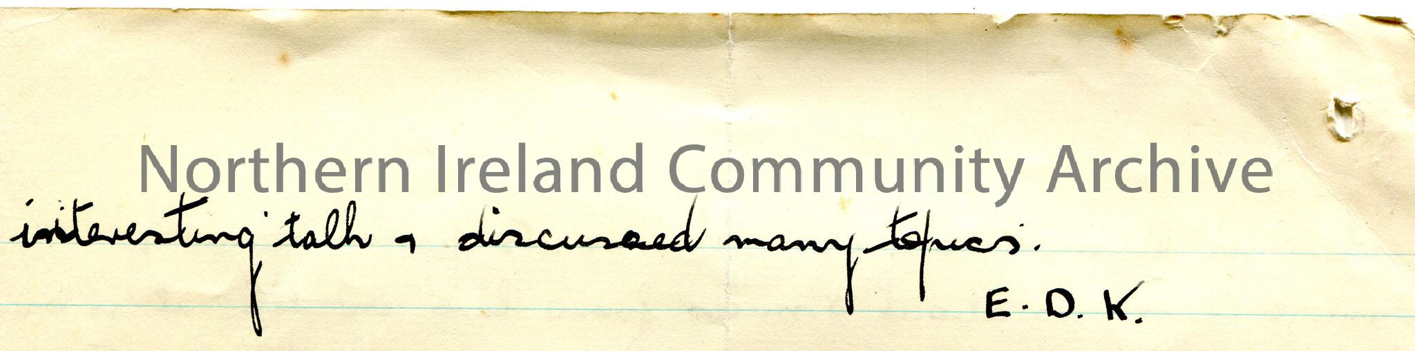 Handwritten answers to questions (double sided on lined paper) initialled E. D. K. Re Benmore Church, Killala, song 'The Fermanagh Quickstep', Drumcose, Drumachose. Encloses 'answers'. He was visited by Bill Beekman and discussed many topics.