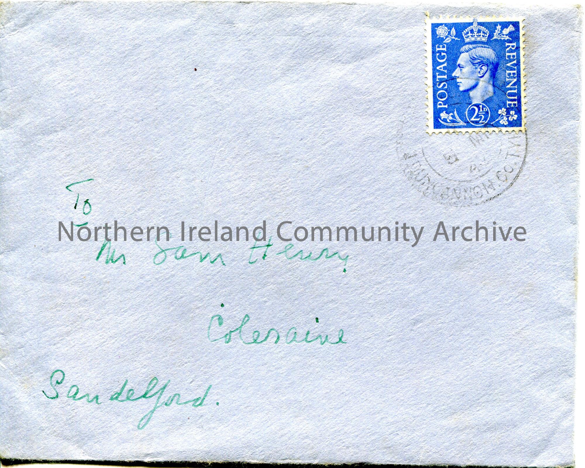 Handwritten blue envelope addressed to Mr Sam Henry, Coleraine, Sandelford. Blue King George VI postage stamp pasted to top corner.