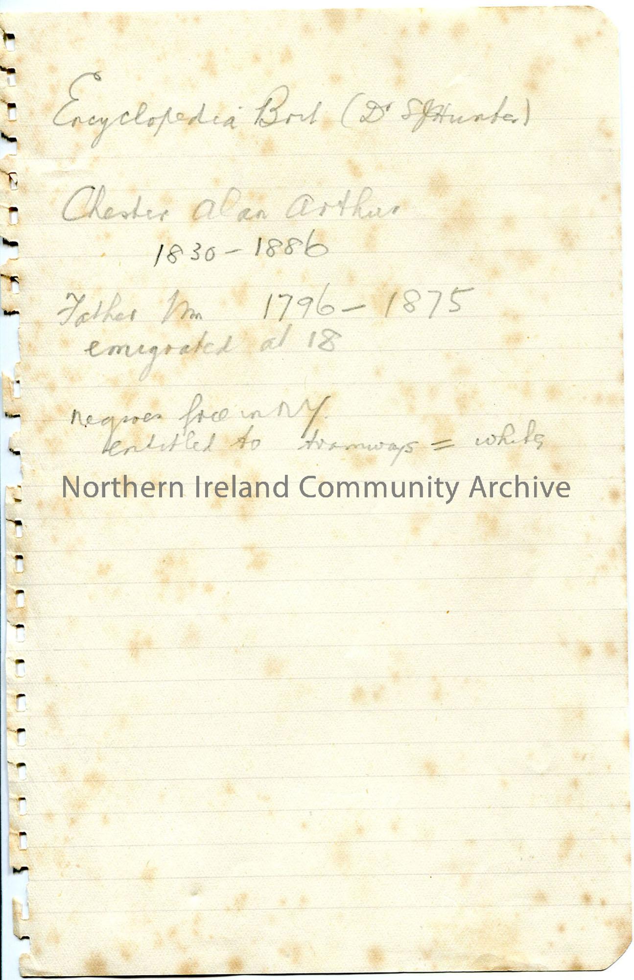 Handwritten brief notes re Chester Arthur