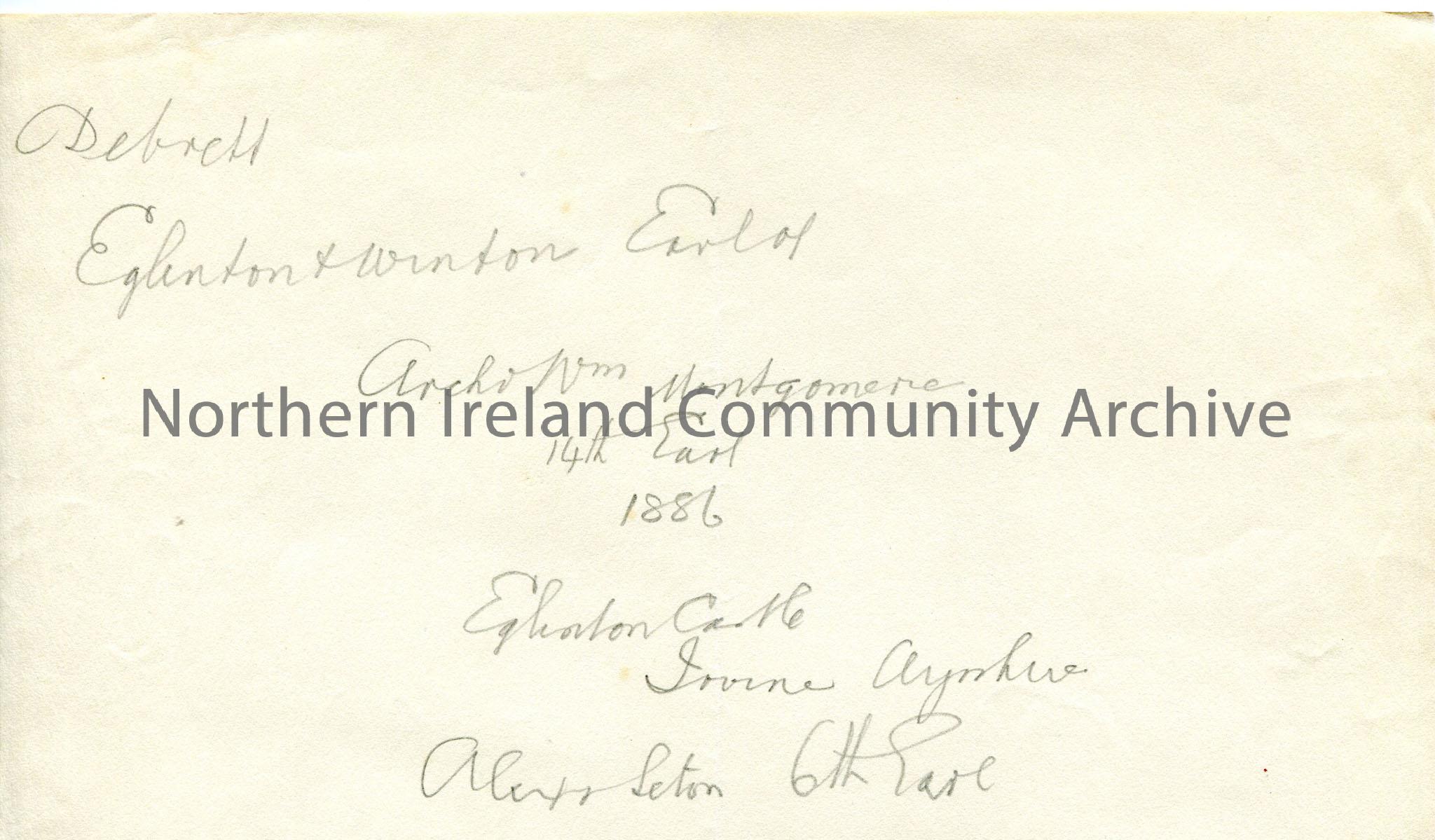 Handwritten brief notes re Eglinton Castle, Irvine, Scotland