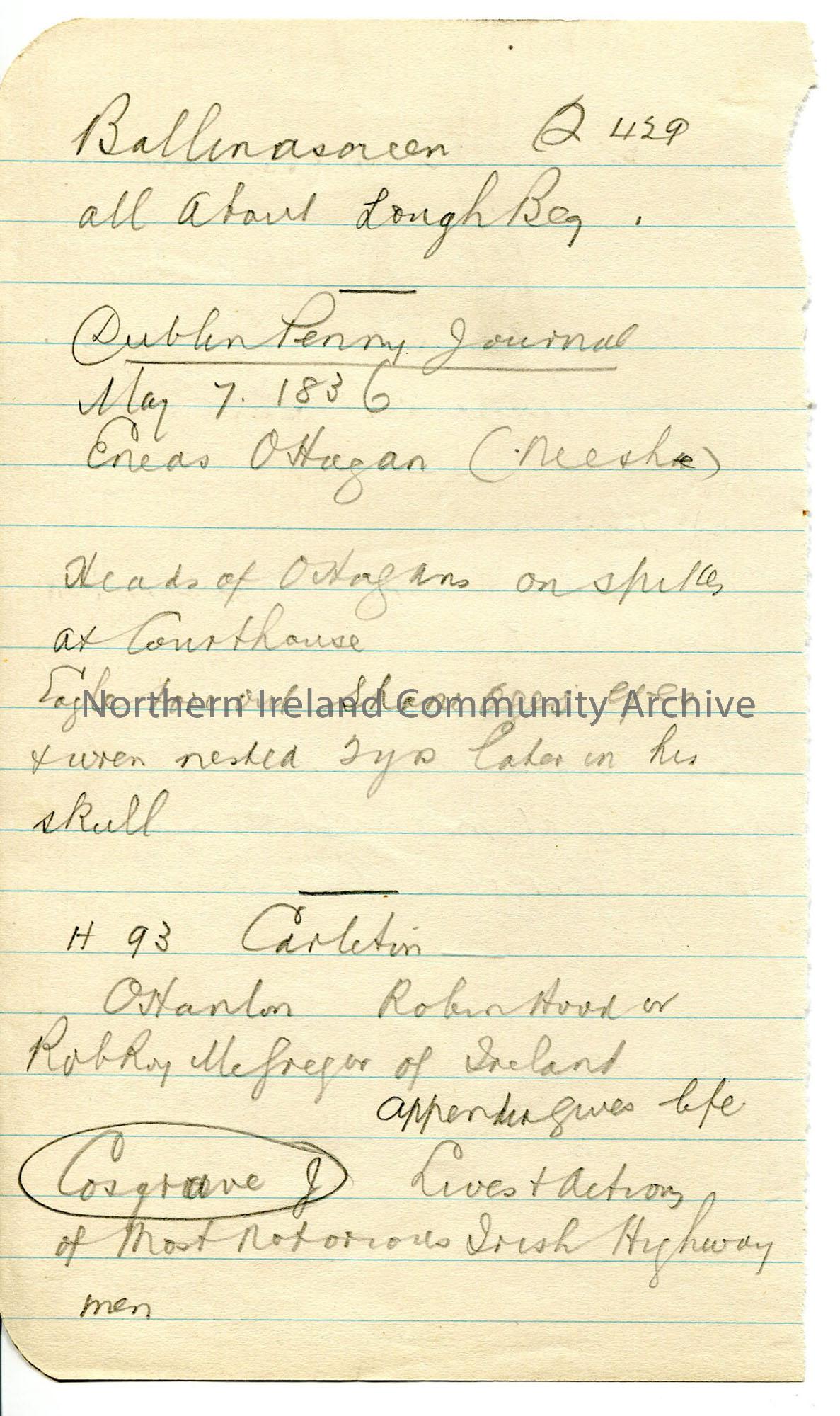 Handwritten brief rough notes on both sides of page, re various unconnected issues - highwaymen, heads on spikes, Galgacus battle against Romans.