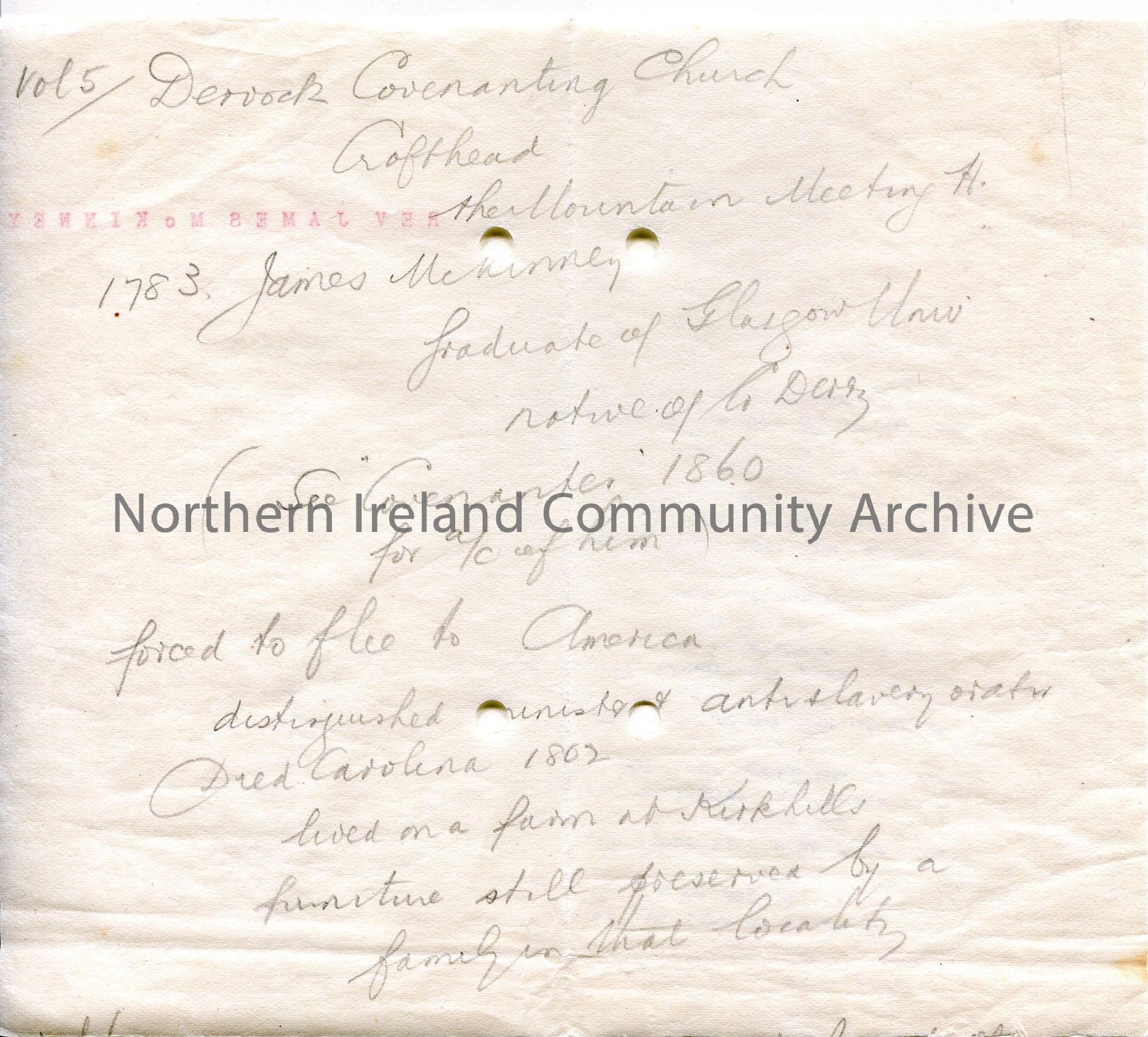 Handwritten brief rough notes re McKinney, Dervock Covenanting Meeting House at Crofthead (see attached), forced to flee to America.