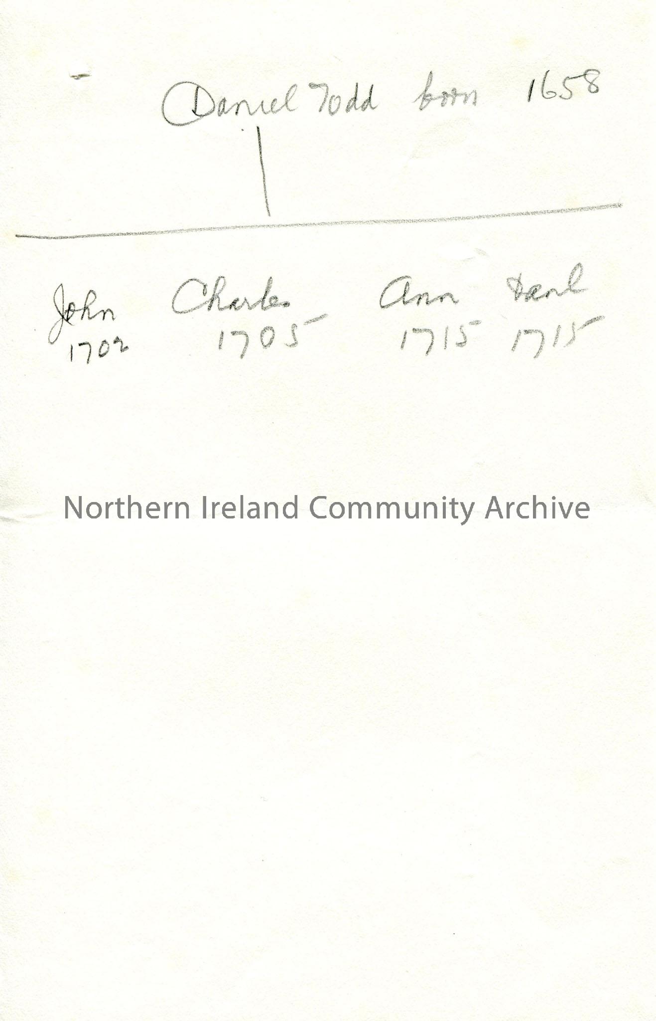 Handwritten brief section of Todd family line - Daniel Todd born 1658 and issue