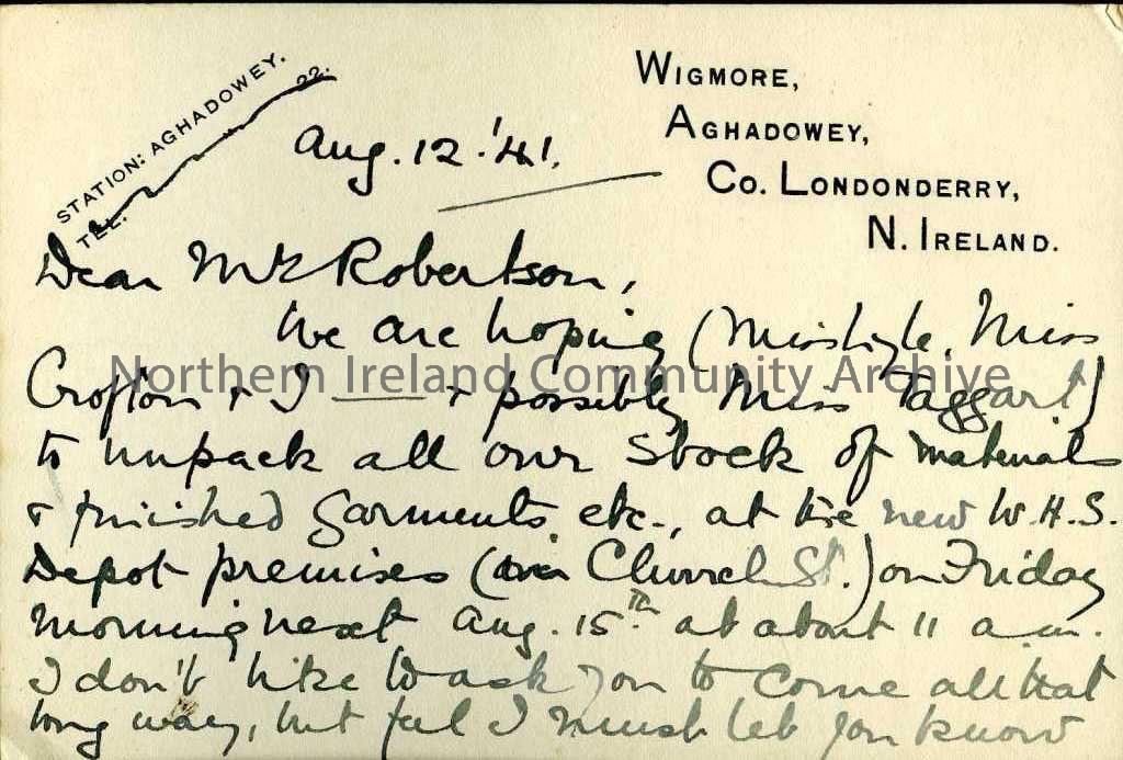 Handwritten card addressed to Mrs Robertson from G.Morrison and dated 12th August 1941. Addressed from Wgmore, Aghadowey, Co.Londonderry, Northern Ireland. Card is regarding Ms Morrison, Miss Lyle, Miss Crofton and possibly Miss Taggart unpacking their stock of materials and finished garments at the new W.H.S Depot premises at Church Street, Coleraine and she is asking if Mrs Robertson would be available to help.