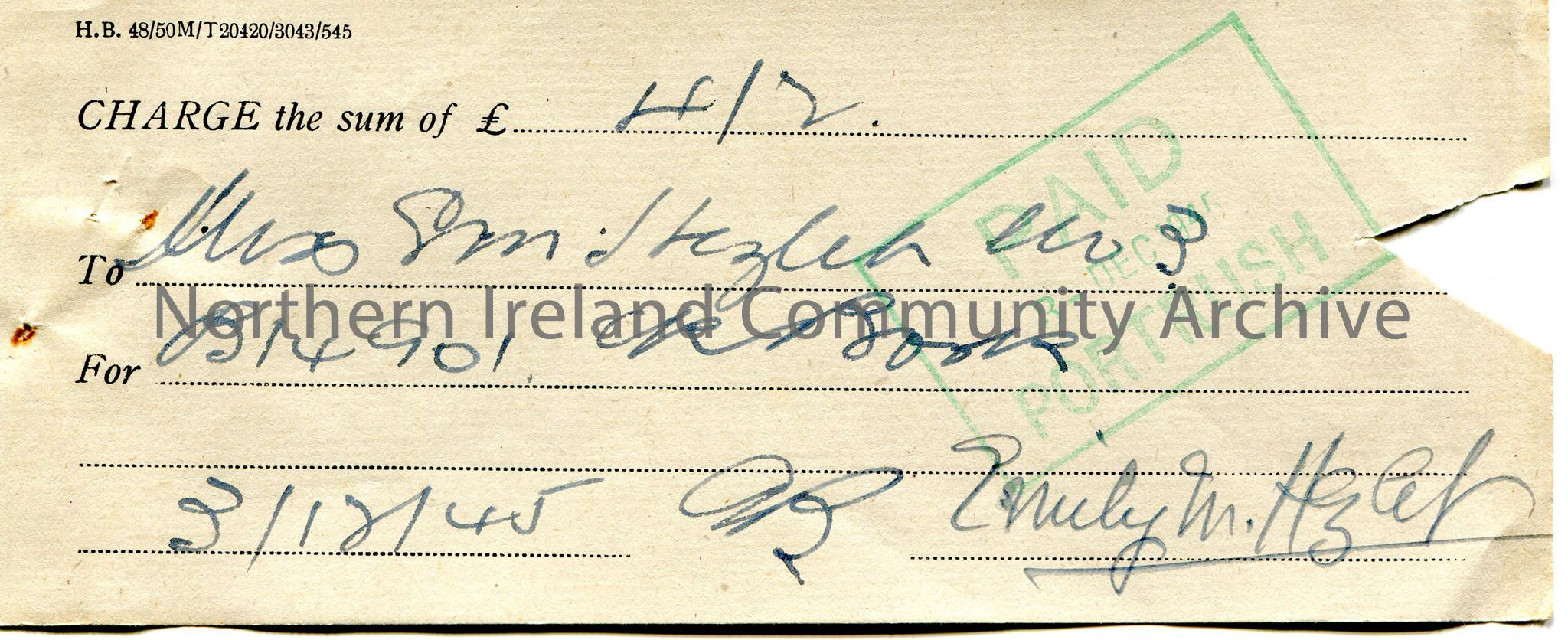 Handwritten cheque or receipt to charge the sum of £4/2 to Miss E. M. Hezlet, No. 3 chequebook for B14901. Dated 3rd October, 1945. Signed by Emi…