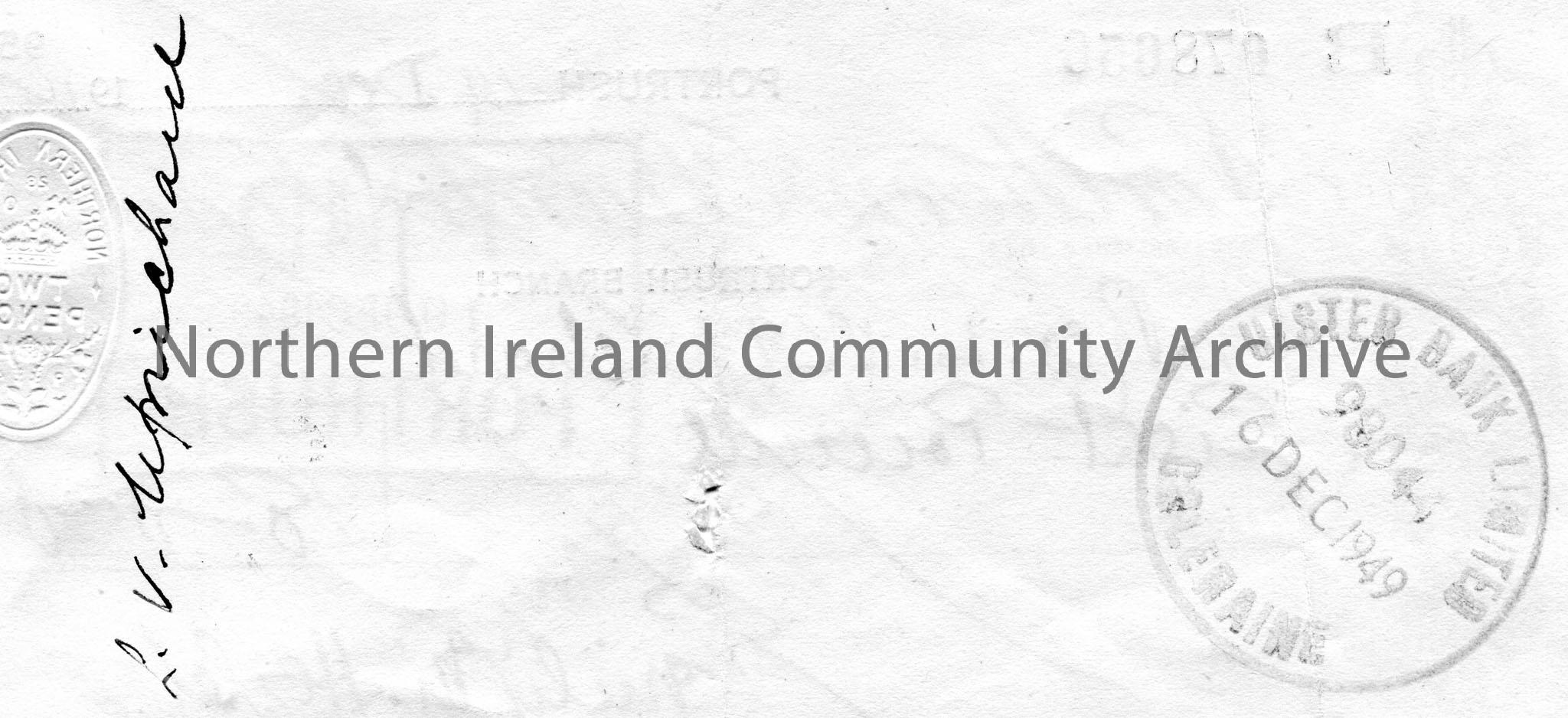 Handwritten cheque payable to Rev. L.V.Uprichard for £8-0-0. Signed by Emily M. Hezlet and dated 14th December, 1949. Cheque no 078656. Northern Bank Limited, Portrush branch. Signed L.V.Uprichard on reverse. Ulster Bank Limited, Coleraine, 16th December, 1949 stamped on reverse. 'Paid 19 Dec 1949 Portrush' stamped on front of cheque as well as a green stamp from Northern Bank Coleraine, 16th December 1949.