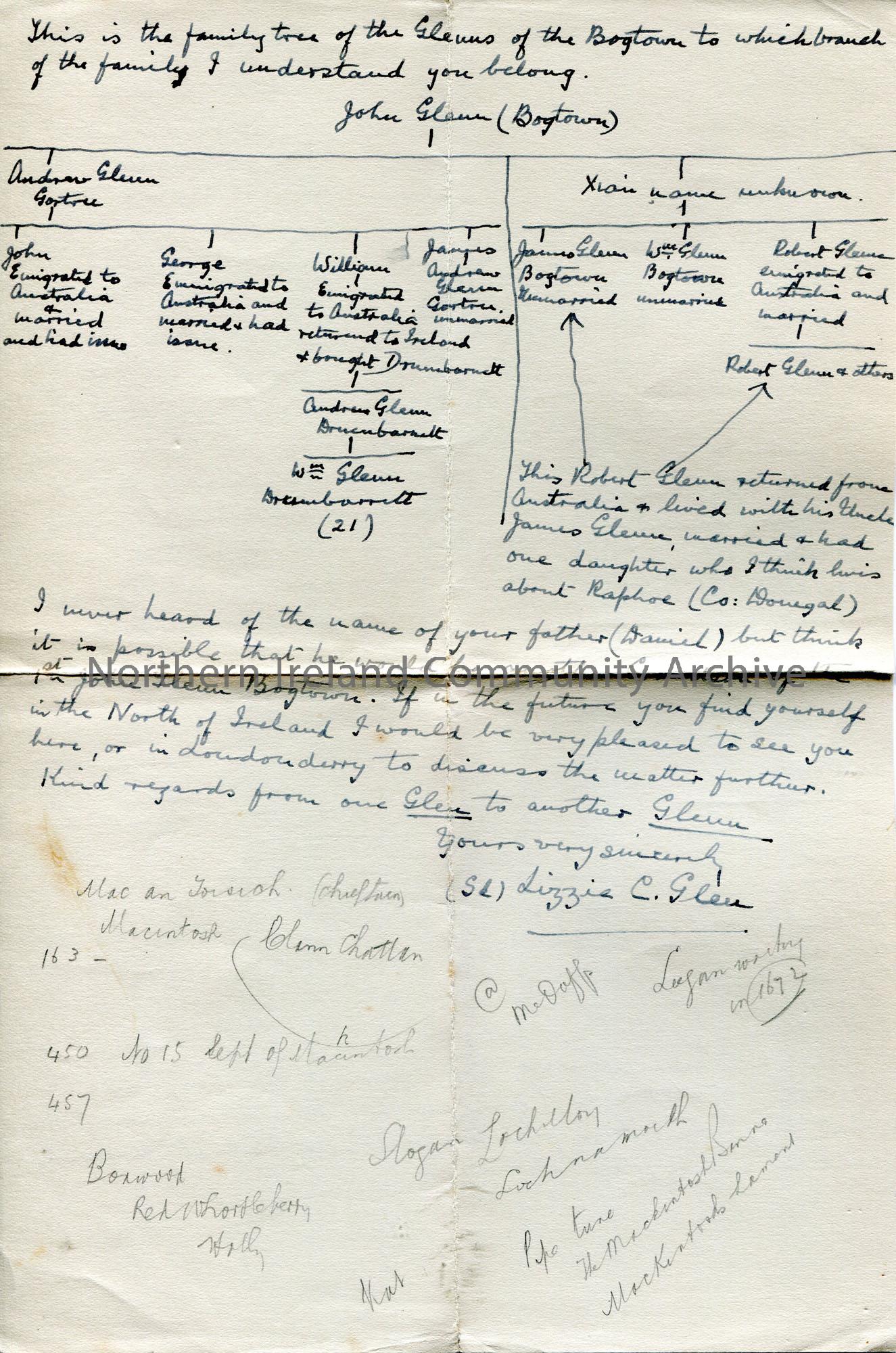 Handwritten copy of a letter to Mr Glenn from Mrs Lizzie Glen. Re family history of the Glenn family. Includes two family trees of the Glenn family - one originating from Coleraine and the other from the Bogtown. Sam's rough notes in pencil on reverse of page.