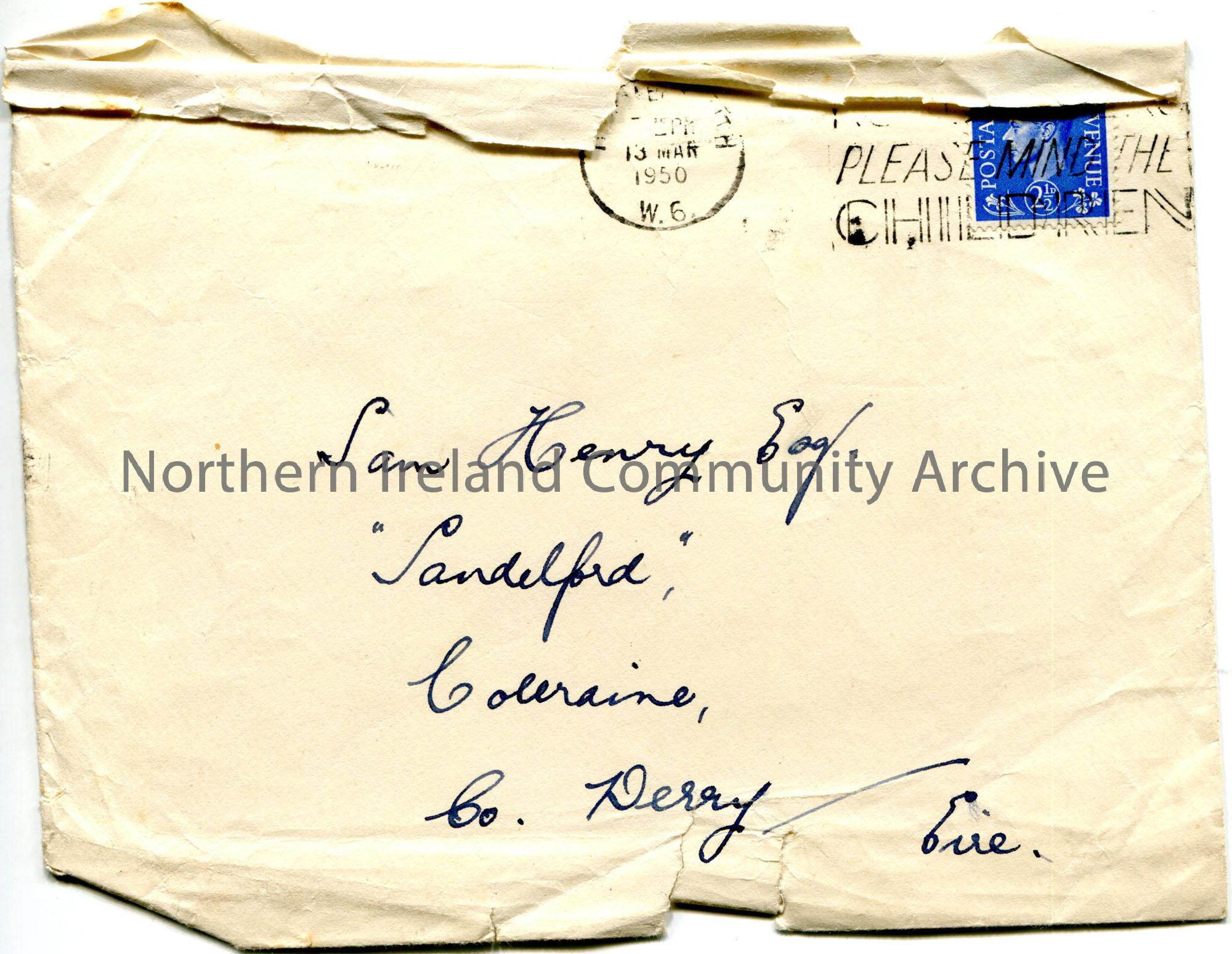 Handwritten cream colour envelope addressed to Sam Henry, Sandelford, Coleraine, Co. Derry, Eire. Stamped 13th March 1950, Hammersmith. Blue King George VI postage stamp pasted to top right corner. Liverpool stamp on reverse.