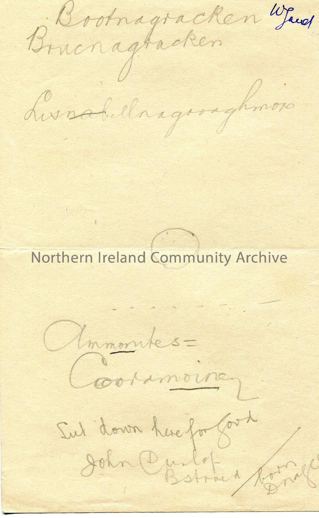 Handwritten document in pencil. Possibly place names- Bootnagracken. Includes other illegible words.