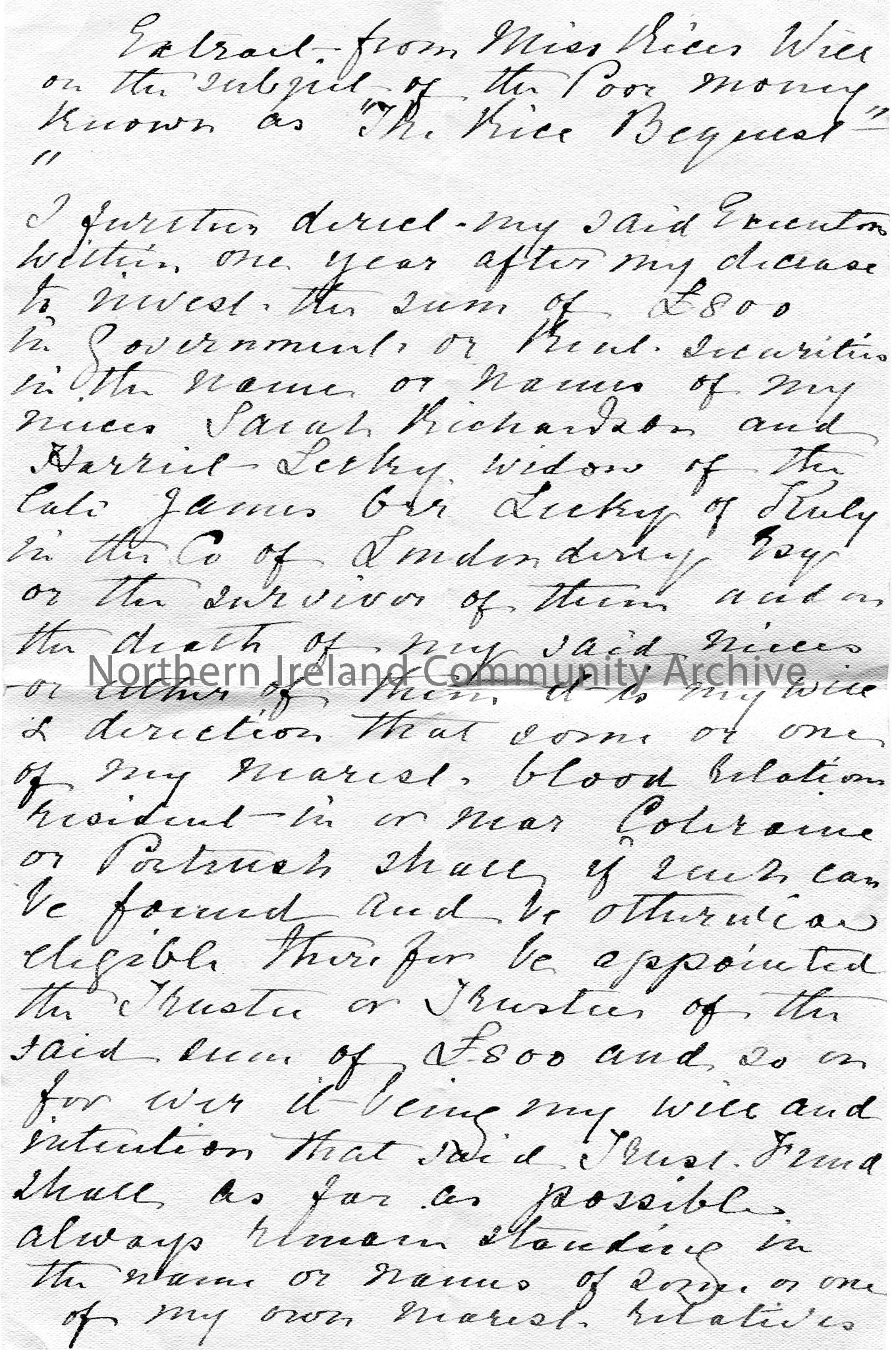 Handwritten, double sided, 'Extract from Miss Rices' Will on the subject of the Poor Money known as "The Rice Bequest"'. Instructions for £800 to be paid one year after her death. Mentions nieces Sarah Richardson and Harriet Lecky, widow of James Orr Lecky. Mentions distributing money in November and March to each of the poor houses in Coleraine, Killowen, Portrush and the Ring ? Road.