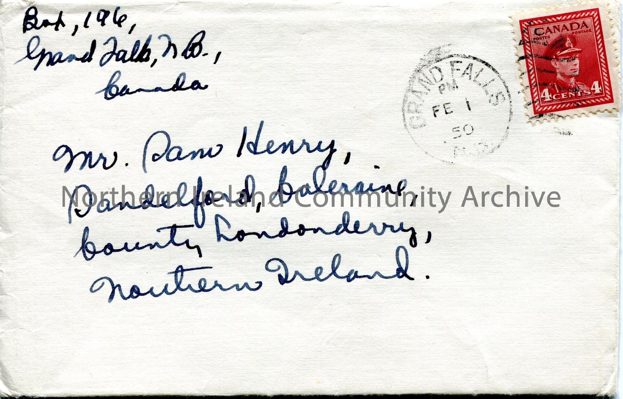 Handwritten envelope address to Mr Sam Henry, Sandelford, Coleraine, County Londonderry, Northern Ireland. From Grand Falls, Canada. Red 4 cents George VI postage stamp pasted to top right corner.