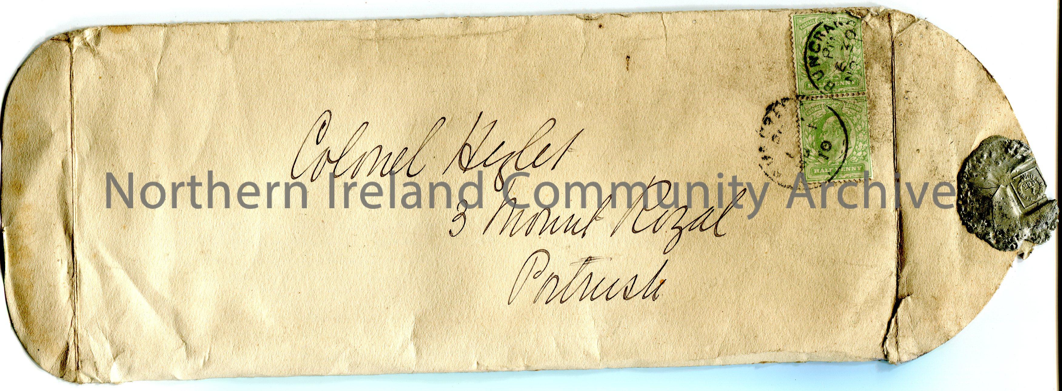 Handwritten envelope addressed to Colonel Hezlet, 3 Mount Royal, Portrush. Two date stamps on front for Buncrana 1910. Stamp on back for 'Portrush 8 AH No 2 10'. Numerical calculations handwritten in pencil also on back of envelope. Silver/grey coloured wax seal on right opening. It features a square stamp with circle inside it around an image and text (unclear what this is). Two green half penny Edward VII postage stamps on front of envelope.