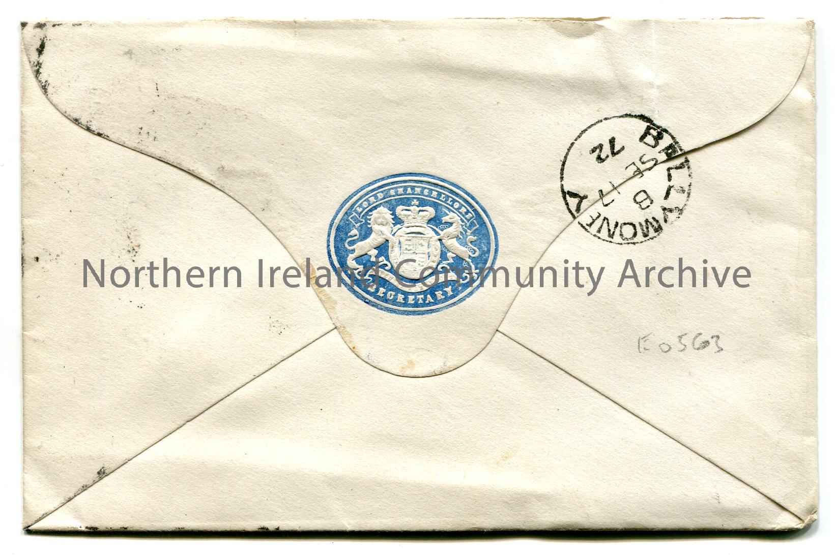 Handwritten envelope addressed to John Hezlet, Bovagh, Aghadowey, Ballymoney. Date stamp of Dublin 16th September, 1872. Red one penny Queen Victoria postage stamp with perforated edges pasted to top right corner. Embossed blue coloured Lord Chancellors Secretary seal on back of envelope. Black date stamp of Ballymoney 17th September 1872 on back of envelope.