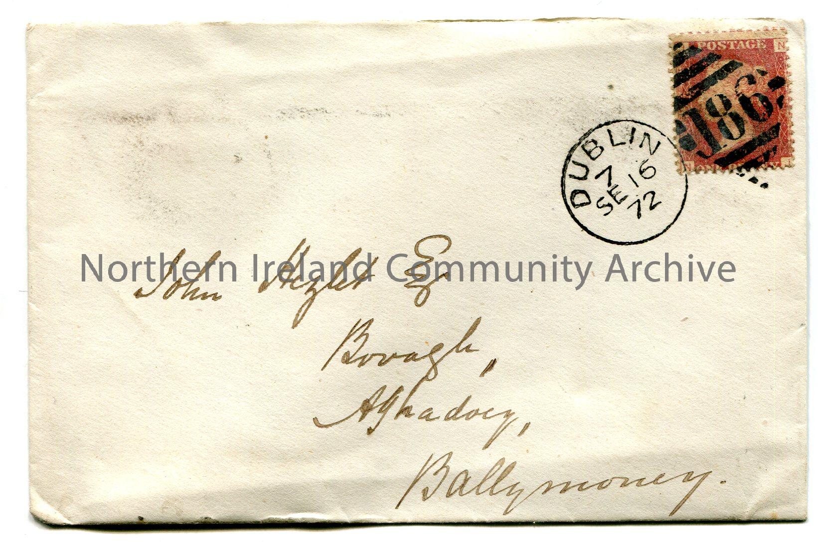 Handwritten envelope addressed to John Hezlet, Bovagh, Aghadowey, Ballymoney. Date stamp of Dublin 16th September, 1872. Red one penny Queen Victoria …