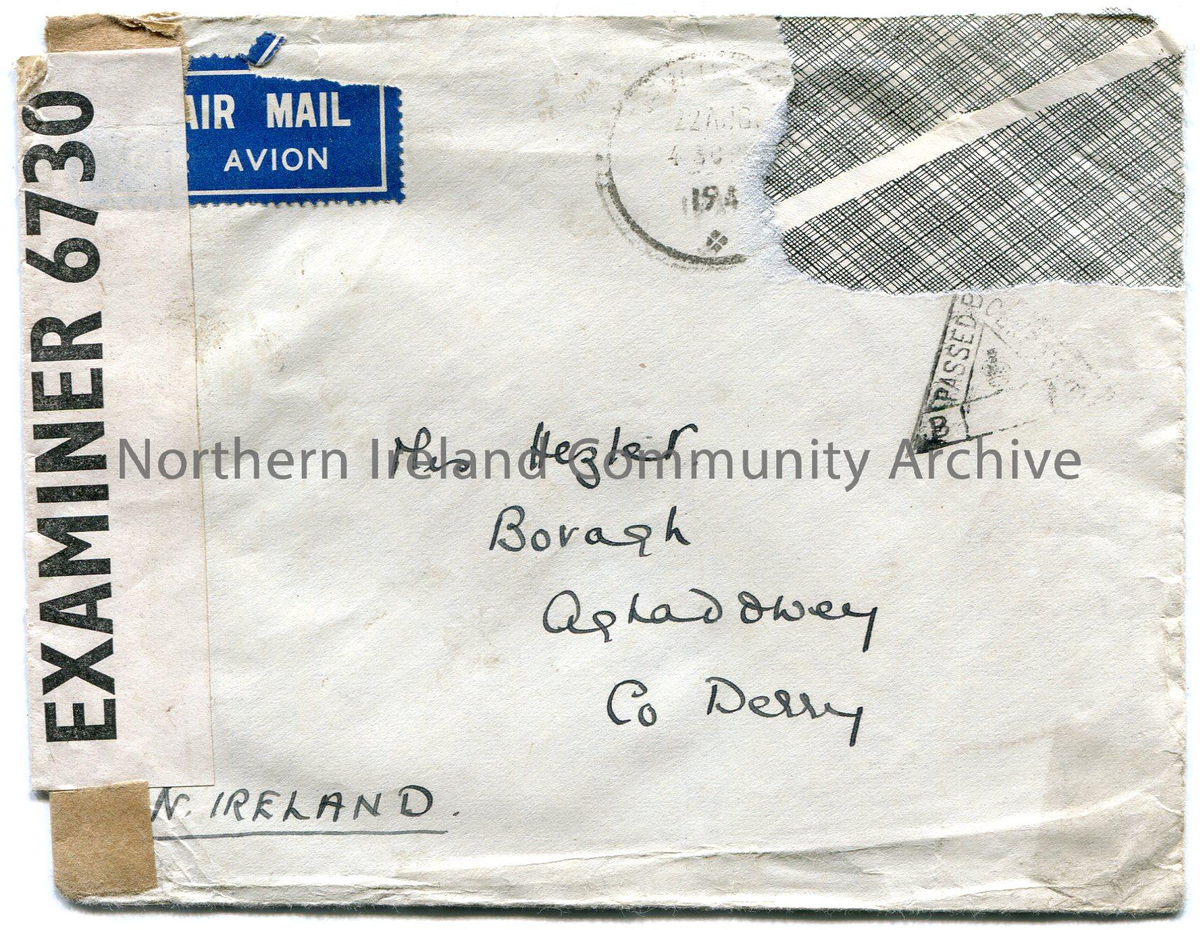 Handwritten envelope addressed to Mrs Hezlet Bovagh Aghadowey, Co. Derry, N. Ireland. From Mrs A. P. Hume, 8 Hastings Road, New Delhi. Sent by Air Mail. Triangular censorship stamp on front. Opened by examiner 6730. Date stamp of 22nd August 194? on front.
