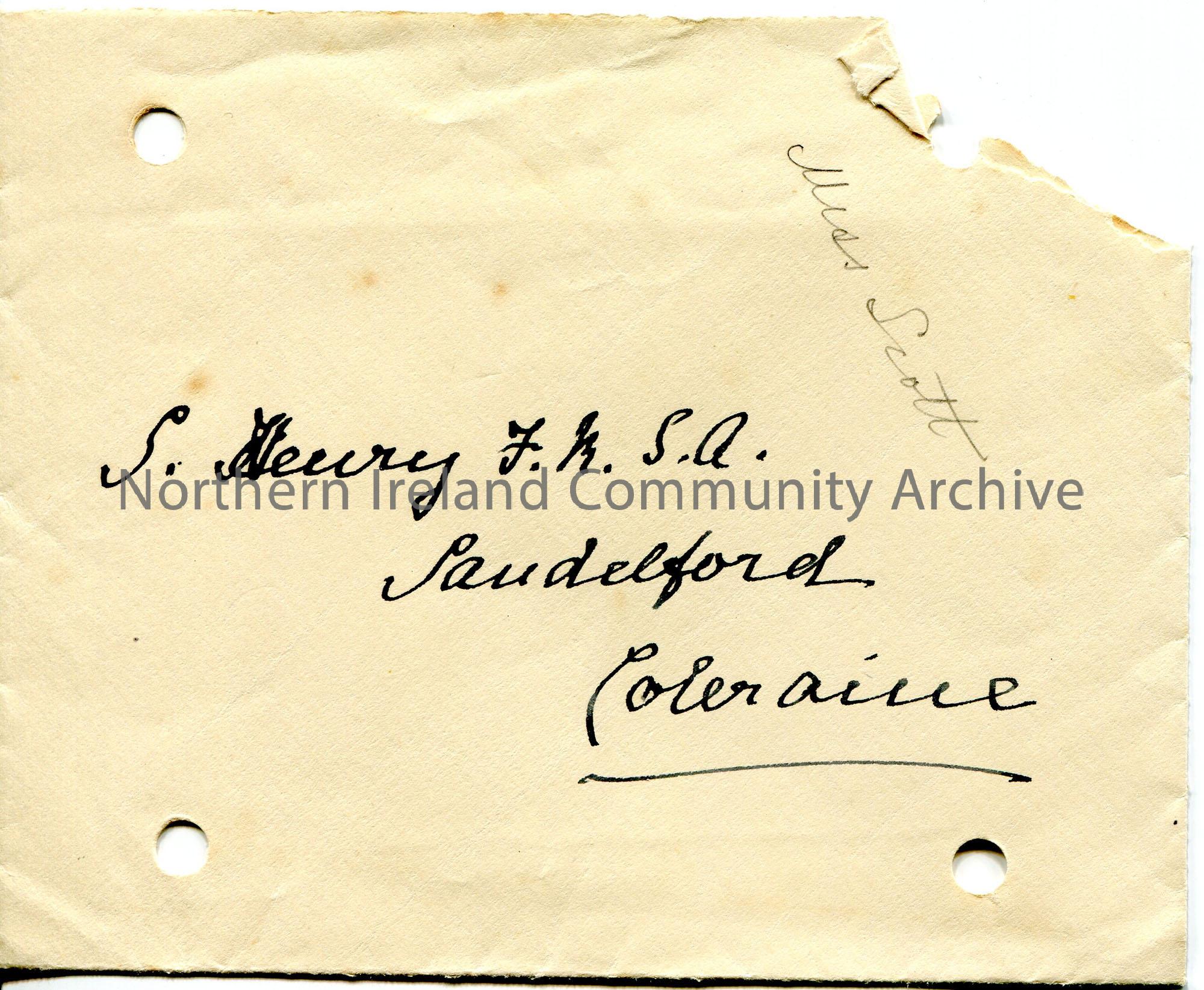 Handwritten envelope addressed to S. Henry, Sandelford, Coleraine.