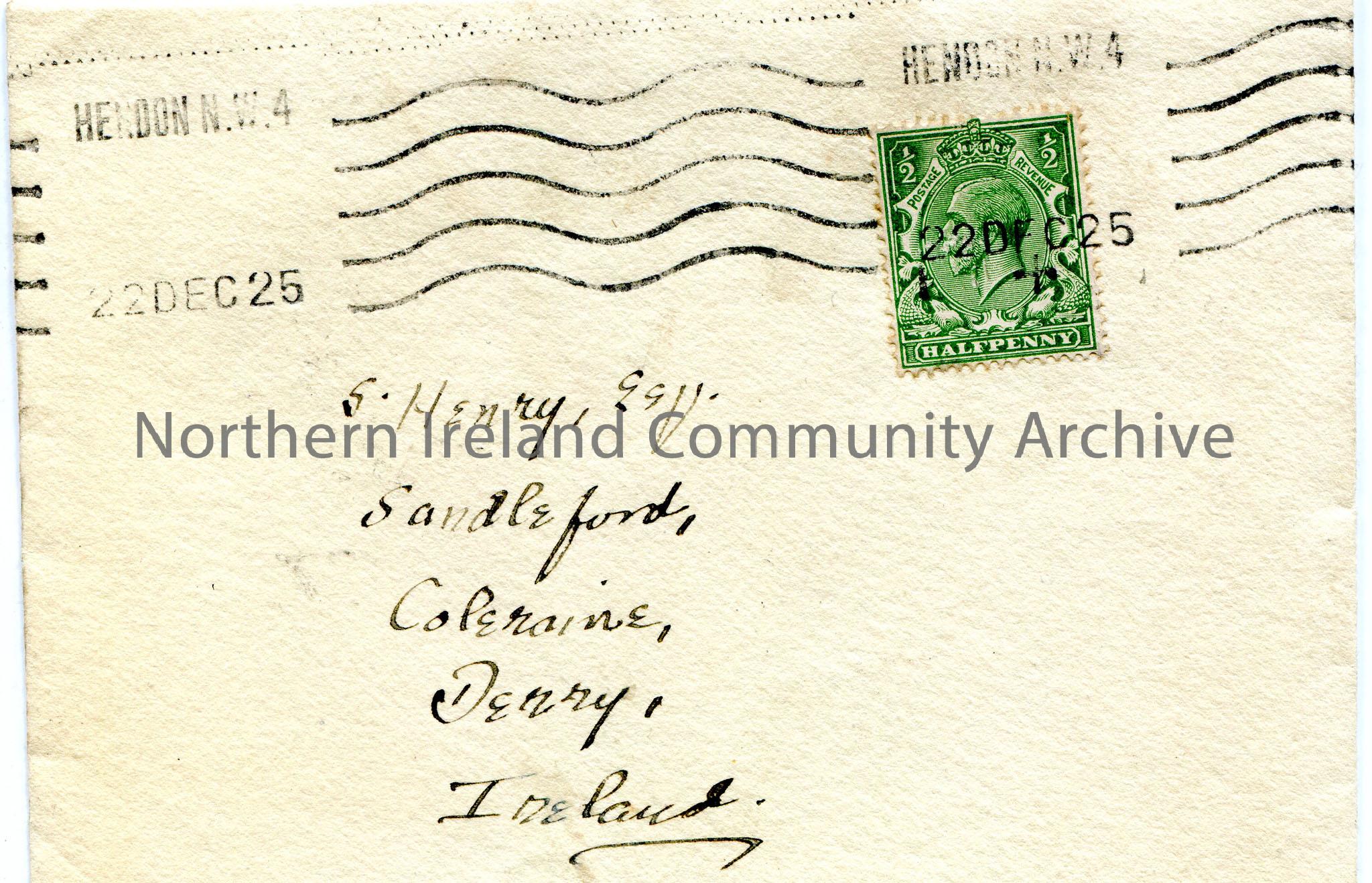 Handwritten envelope addressed to S.Henry, Esq, Sandelford, Coleraine, Derry, Ireland. Date stamped as 22nd December 1925 from Hendon N.W.4. Green halfpenny postage stamp of King George V.
