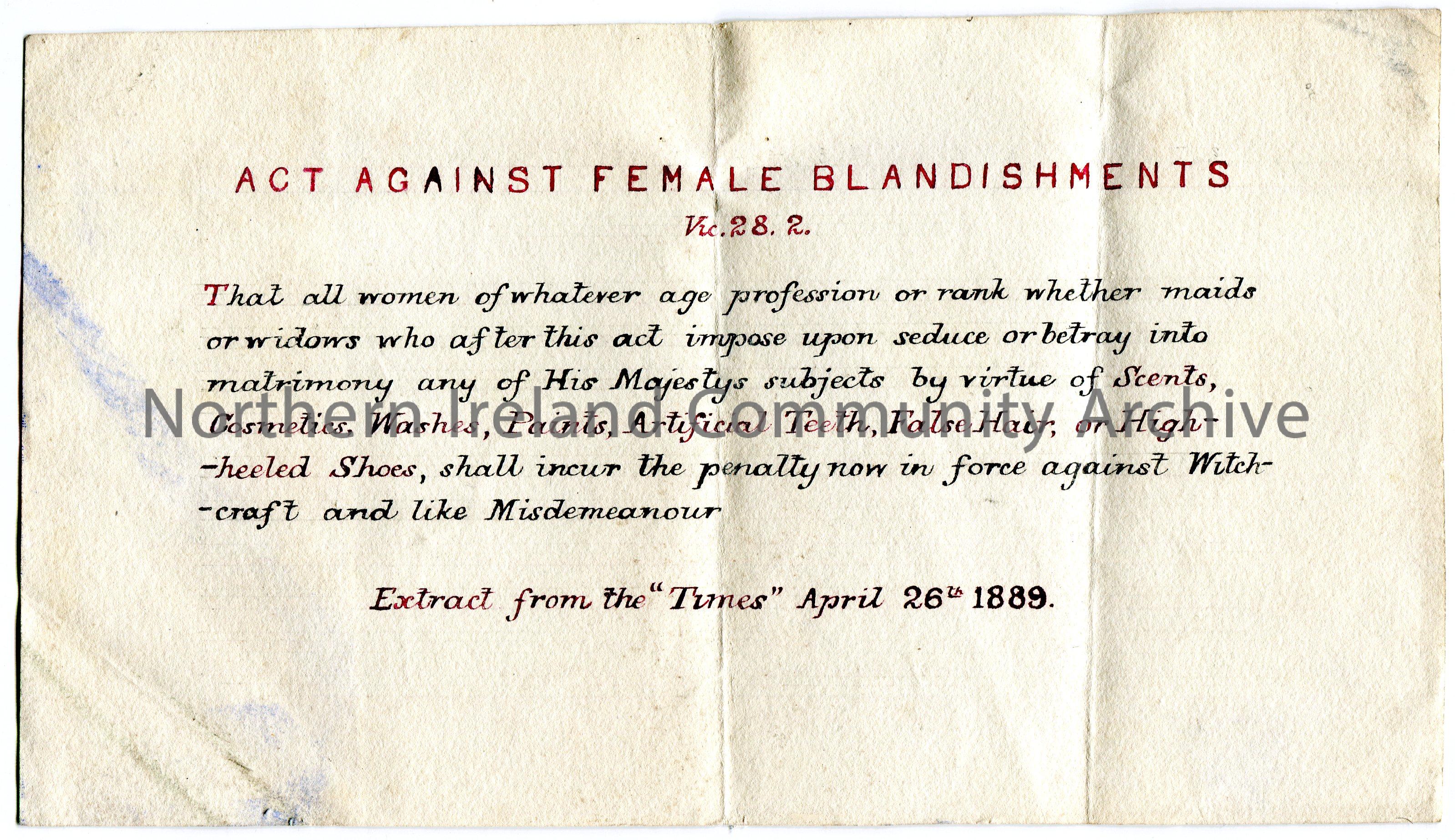 Handwritten extract from the 'Times' dated 26th April 1889. Titled, 'Act Against Female Blandishments'. Prohibiting all women from marriage by seduction or betrayal by way of 'scents. cosmetics, washes, paints, artificial teeth, false hair or high-heeled shoes'.